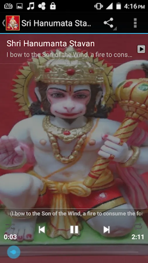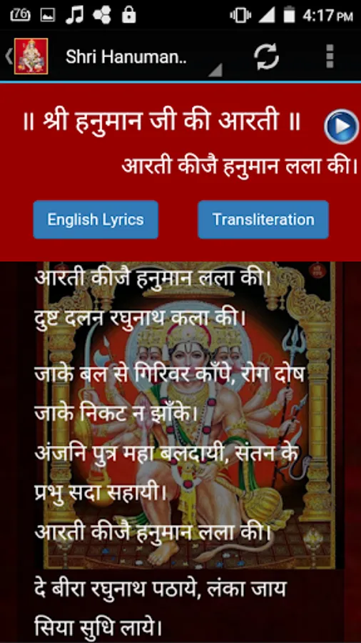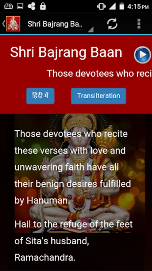 Lord Shri Hanuman Bhakti Sangrah app is a beautiful devotional combination of Chalisa, Sankatmochan Hanuman Astak, Shri Bajrang Baan, Stavana, Kavach and Aarti for Android in Hindi, English Meaning as well as Transliteration text lyrics and Mp3 or Audio format to Listen.