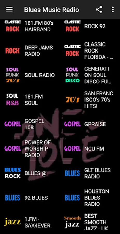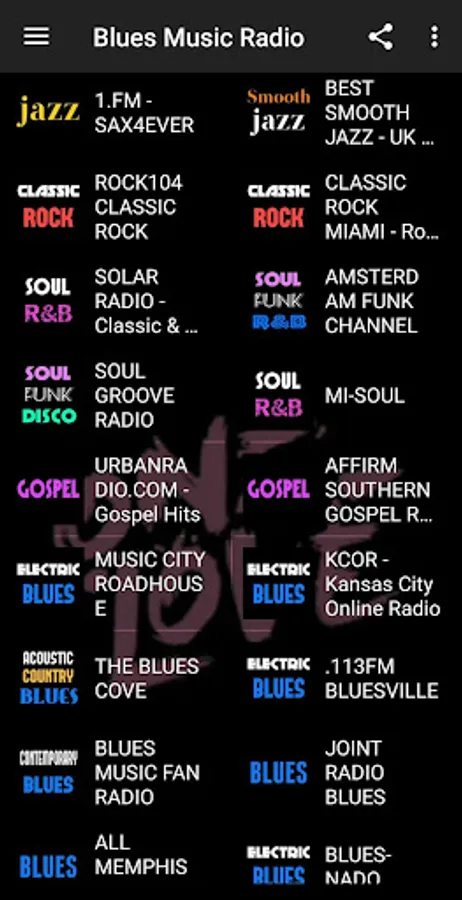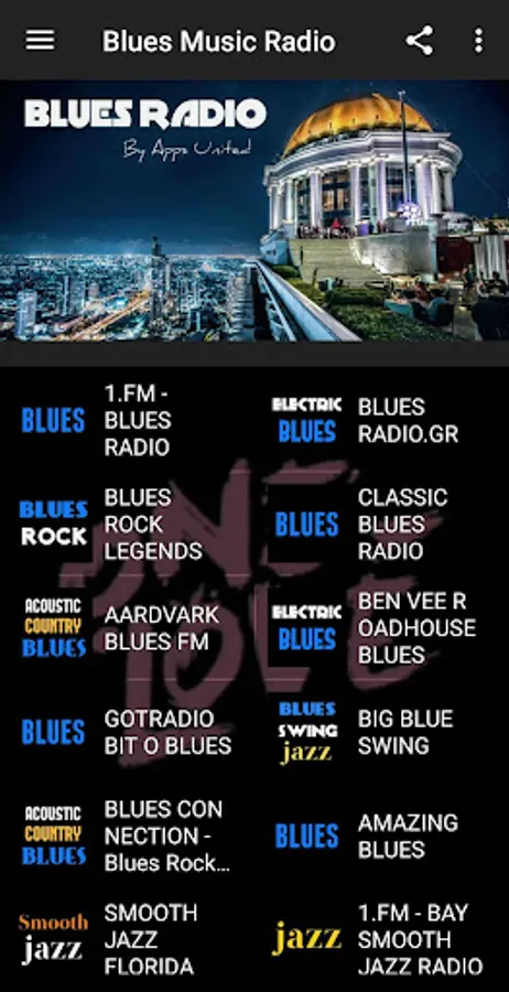 Blues music radio will let you listen blues music, electric blues, country blues, acoustic blues, contemporary blues, chicago blues, classic rock, jazz, smooth jazz, soul, funk, 70s 80s hits, easy listening and more. We select and update the best radios. Choose your favorite and relax! All radios live streaming 24 hours.