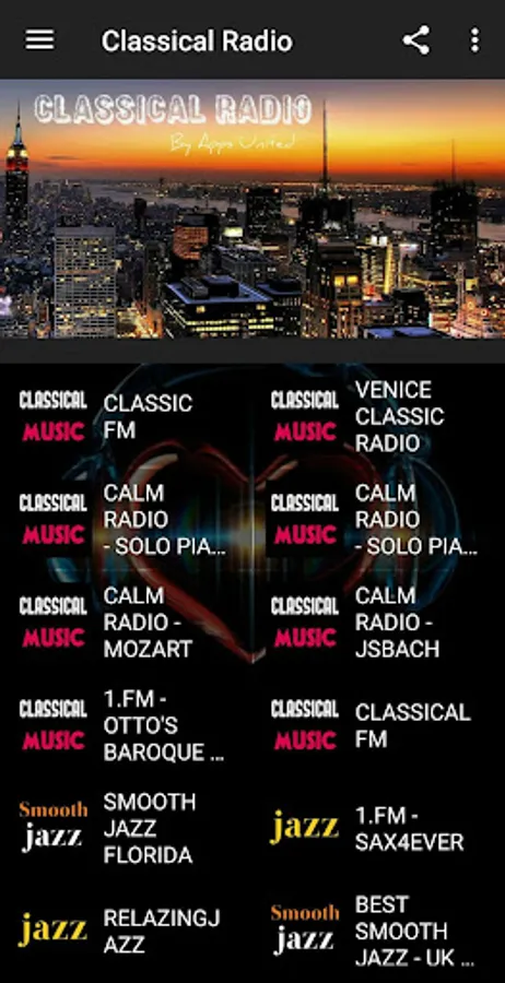 Classical music radio will let you listen the best classical music, jazz music, opera, instrumental, easy listenings, relaxing music, meditation music, gospel and more. We select and update the best radios with the best artists and the best sound. Enjoy and relax yourself. All radios are live streaming 24 hours.