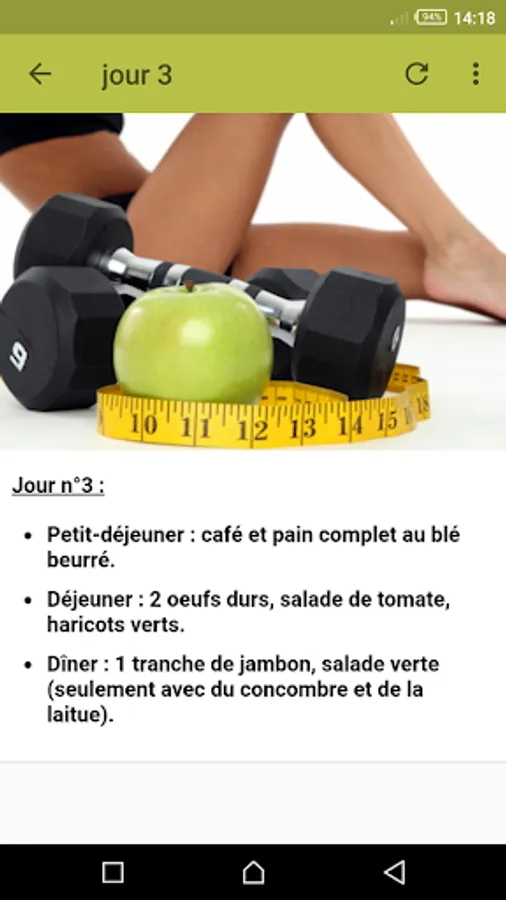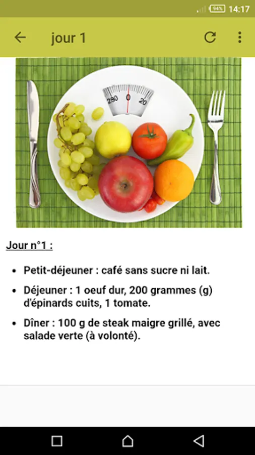 Another example is a typical breakfast is a cup of coffee with a lump of sugar. You are not allowed to exchange tea with coffee or water in the plan. Throughout the program, you drink plenty of water (at least 2 liters per day).