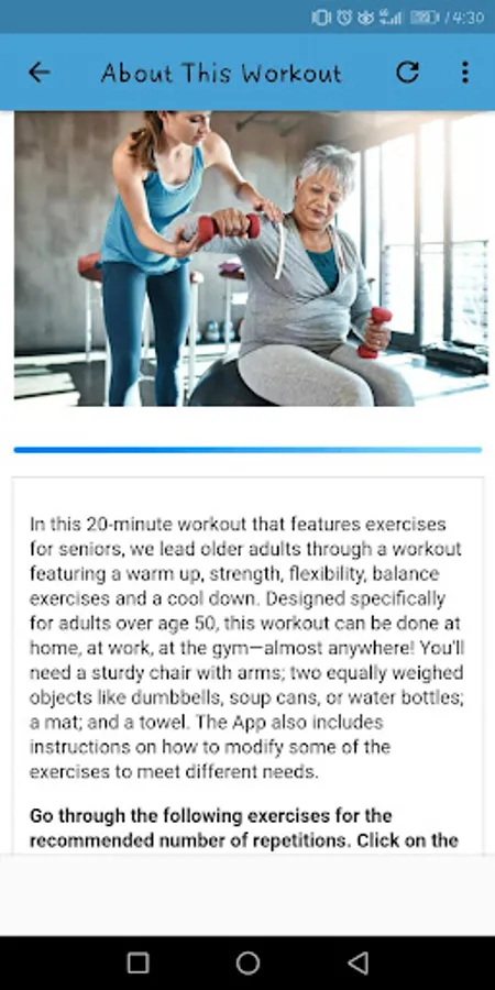 In this 20-minute workout that features exercises for seniors, we lead older adults through a workout featuring a warm up, strength, flexibility, balance exercises and a cool down. Designed specifically for adults over age 50, this workout can be done at home, at work, at the gym—almost anywhere! You'll need a sturdy chair with arms; two equally weighed objects like dumbbells, soup cans, or water bottles; a mat; and a towel. The App also includes instructions on how to modify some of the exercises to meet different needs.