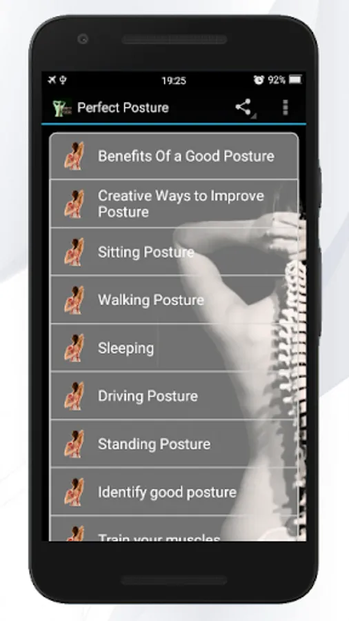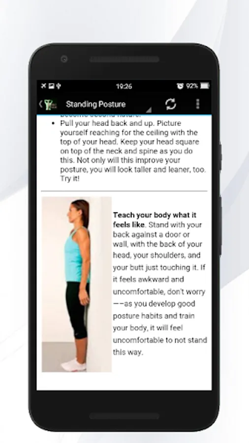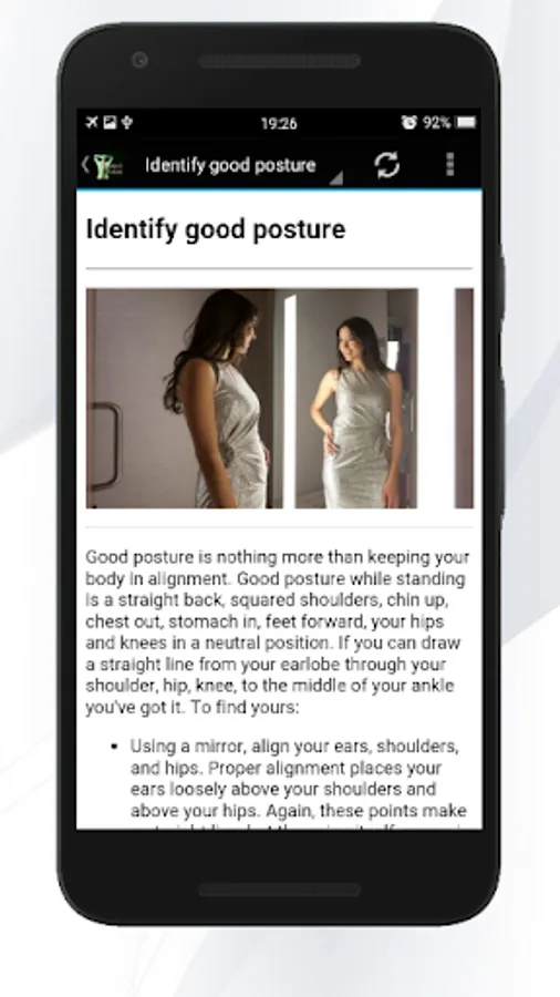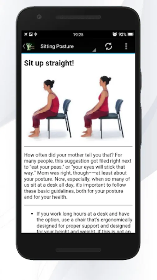 Good posture is a very important way to maintain a healthy mind and body. When you practice correct posture, your body is in alignment with itself. This can alleviate common problems such as back or neck pain, headaches, and fatigue. Being in good general health and standing (or sitting) tall will also boost your bearing and self confidence. This App will show you several ways to develop and maintain good posture.
