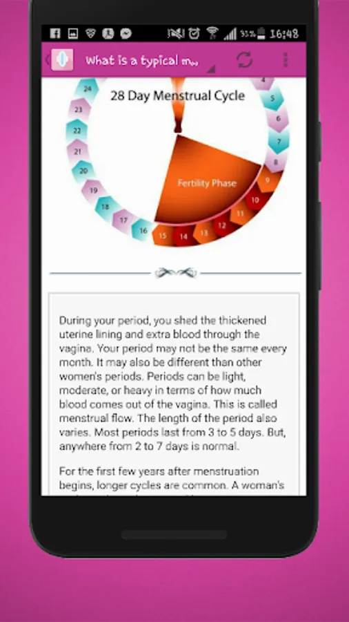 When periods (menstruations) come regularly, this is called the menstrual cycle. Having regular menstrual cycles is a sign that important parts of your body are working normally. The menstrual cycle provides important body chemicals, called hormones, to keep you healthy.