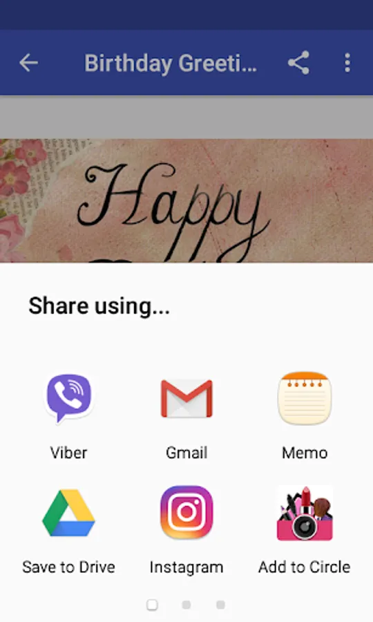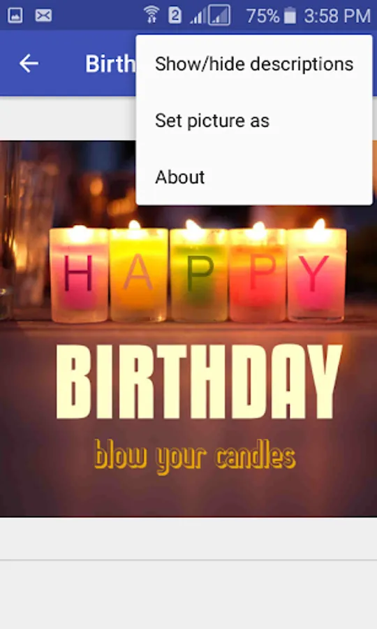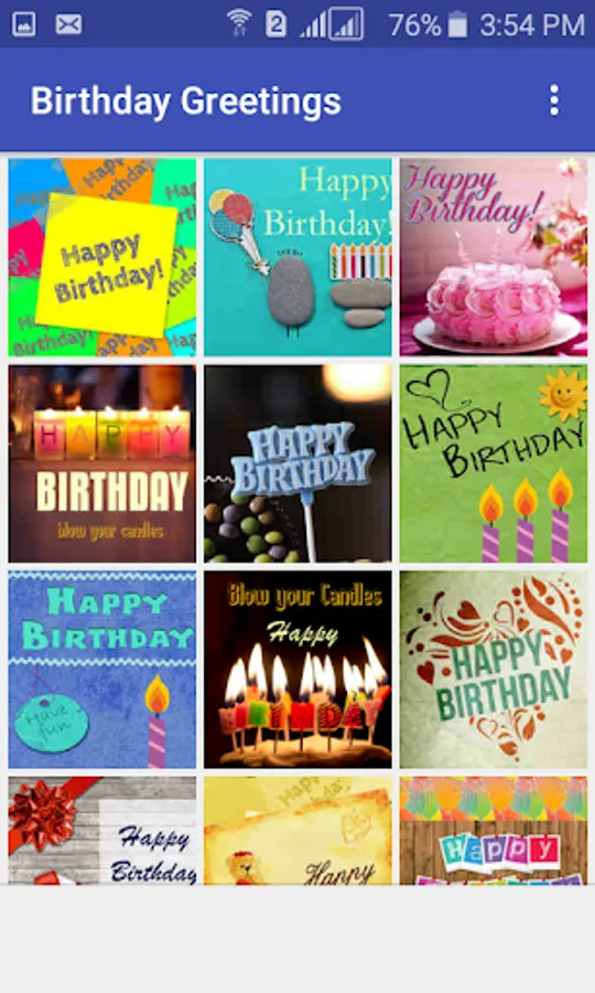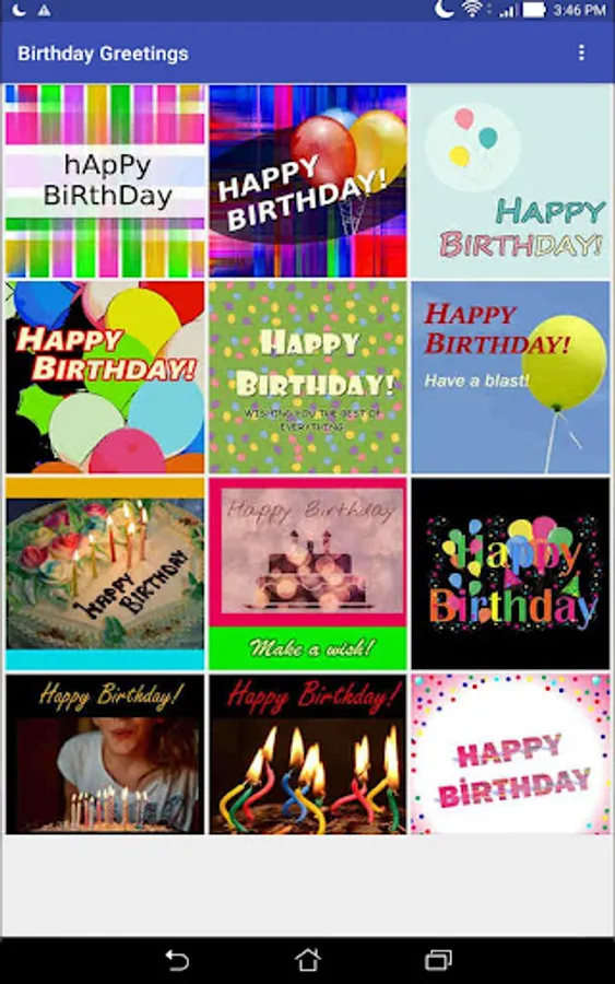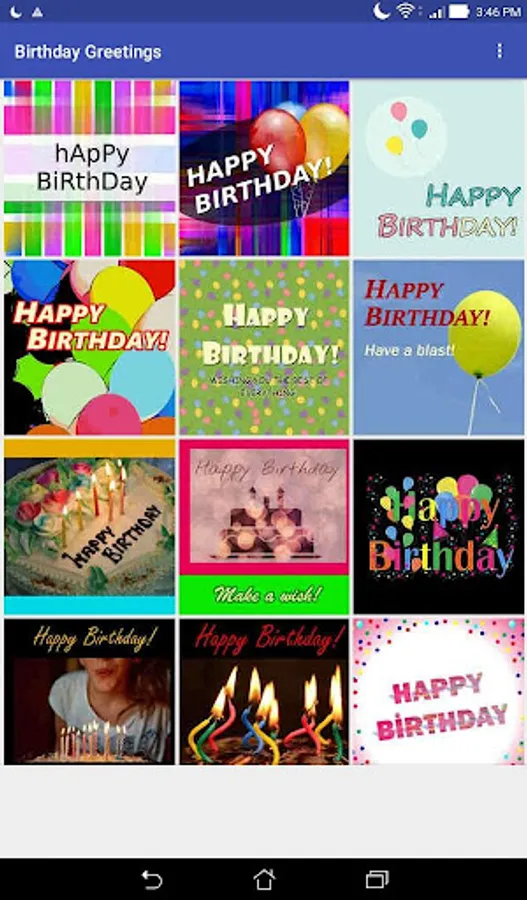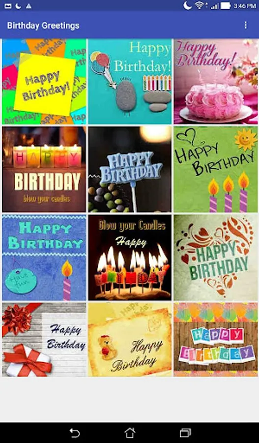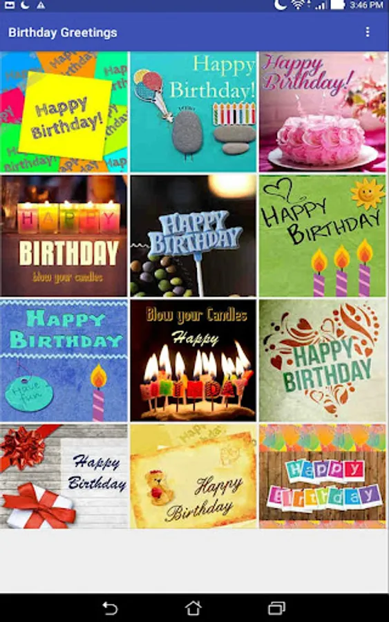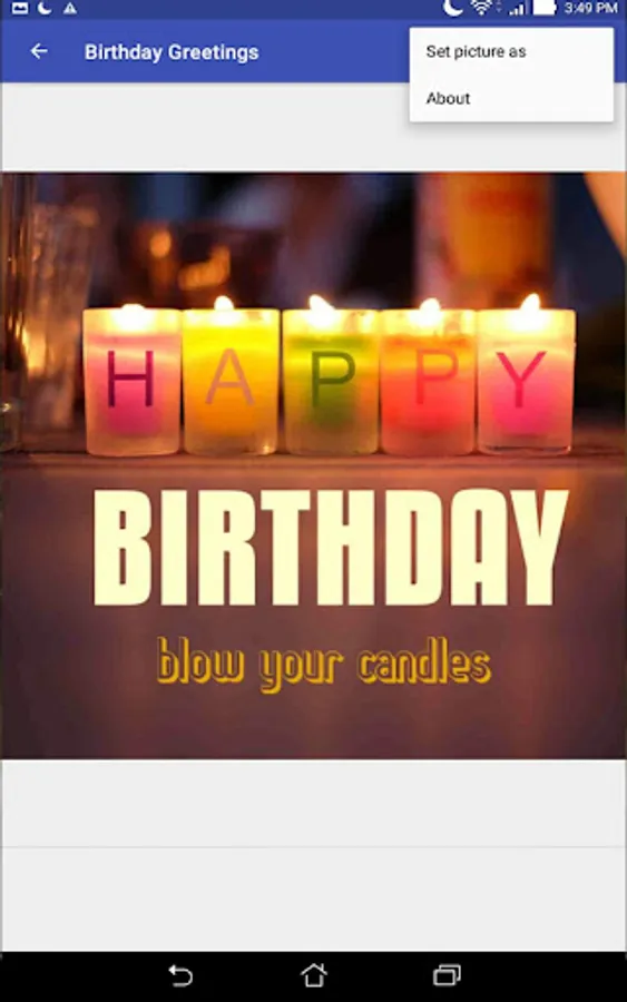 Free android app containing shareable happy birthday greetings. Images can also be set as wallpaper.