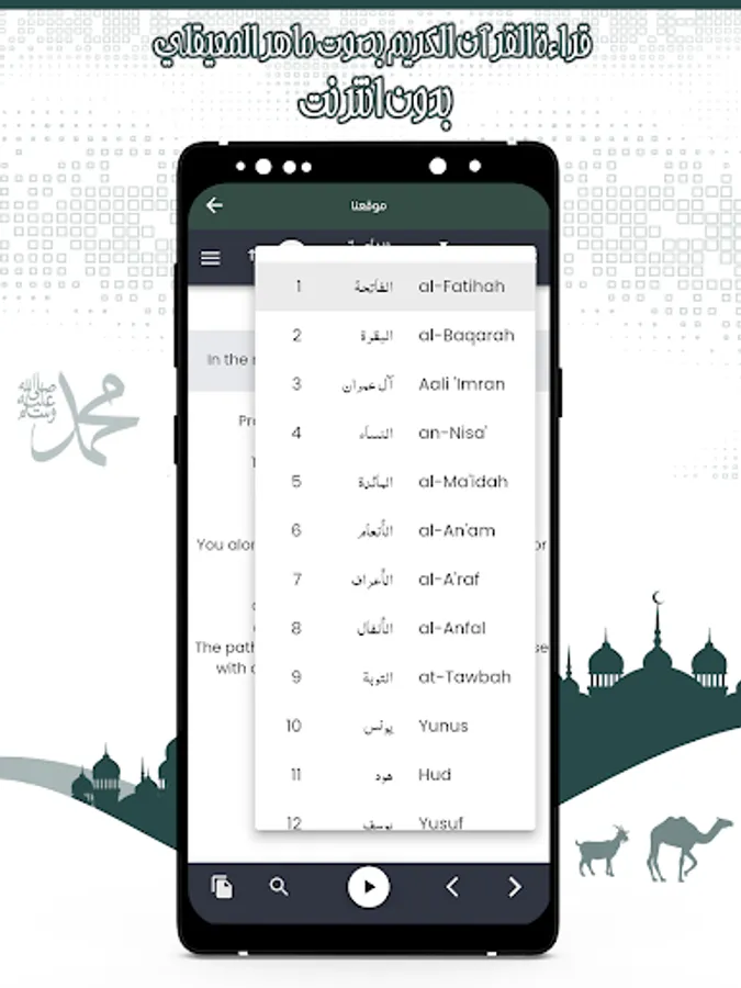 The application of the Noble Qur’an with the voice of Maher Al-Moaqeli enables you to listen to all the surahs of the Holy Qur’an after specifying the name of the surah that you want to listen to, which is recited by Sheikh Maher Al-Moaqeli in every surah.