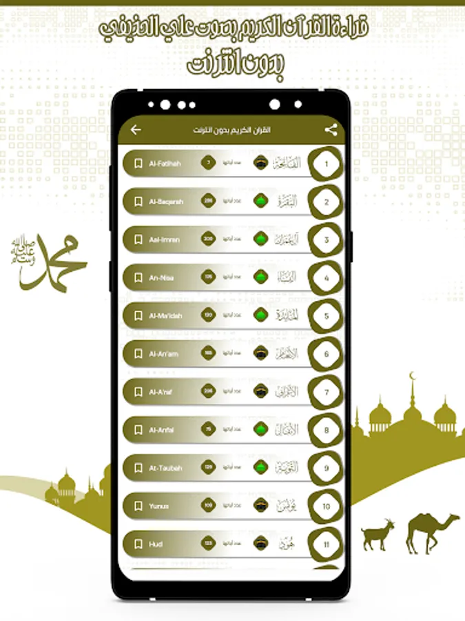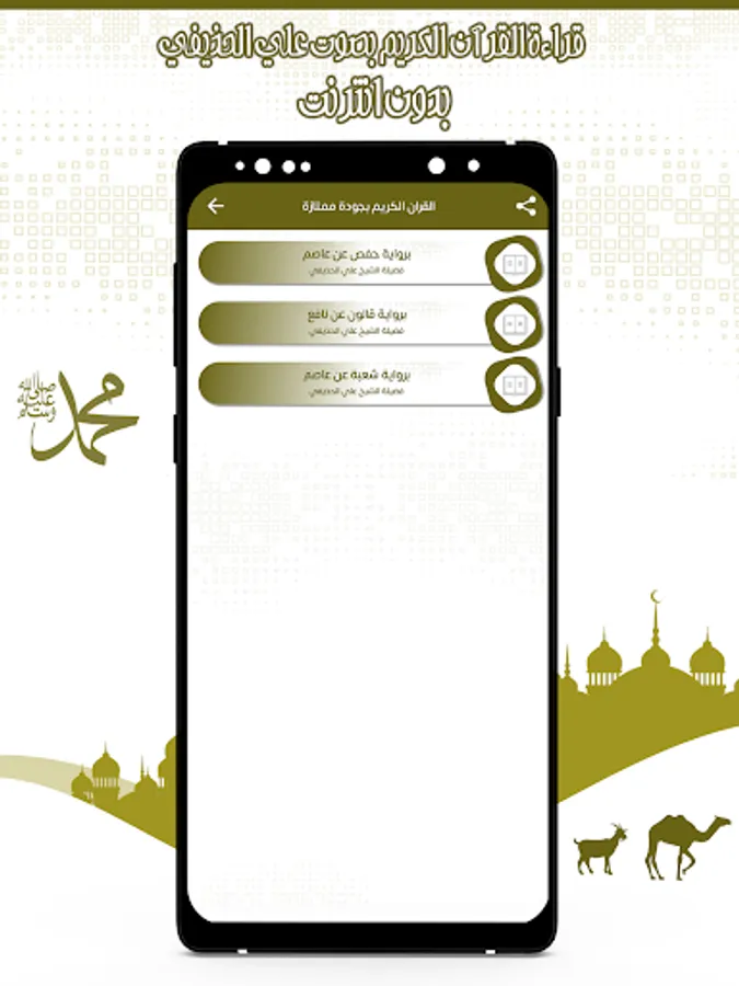 As we mentioned, the interface of the Noble Qur’an application with the voice of Ali Al-Hudhaifi is a simple interface that enables young or old users to listen to the Noble Qur’an and use the application with ease away from complexity.