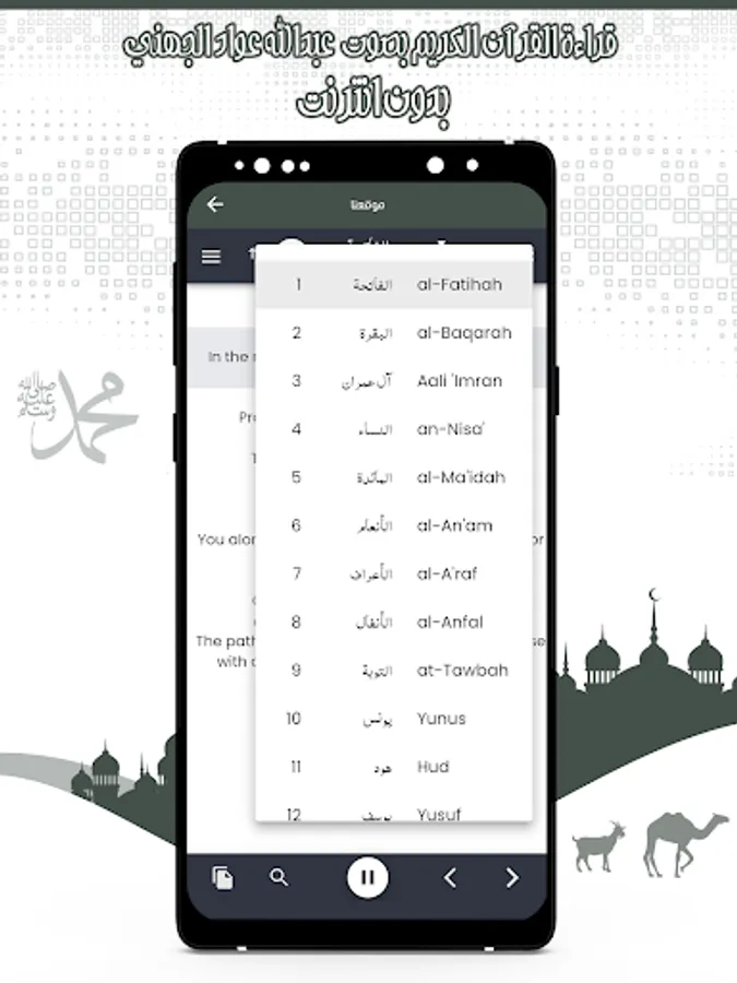 The application of the Noble Qur’an with the voice of Abdullah Awad Al-Juhani enables you to listen to all surahs of the Noble Qur’an after specifying the name of the surah that you want to listen to, which Sheikh Abdullah Awad Al-Juhani recites in each surah.