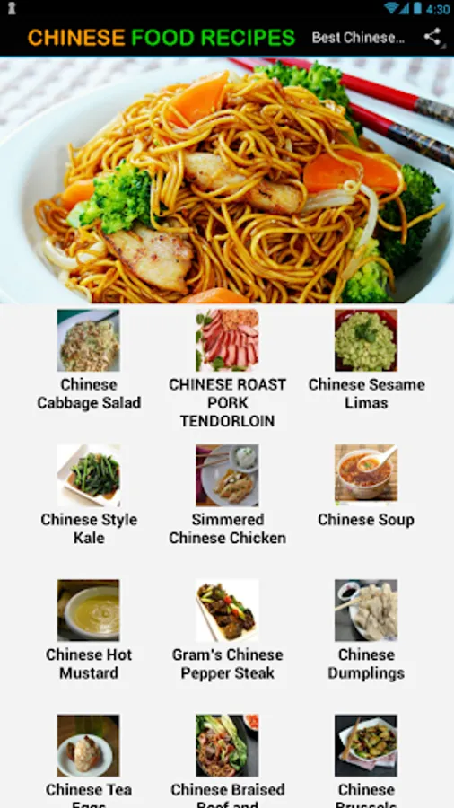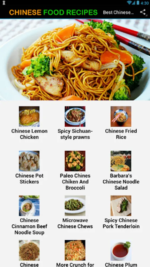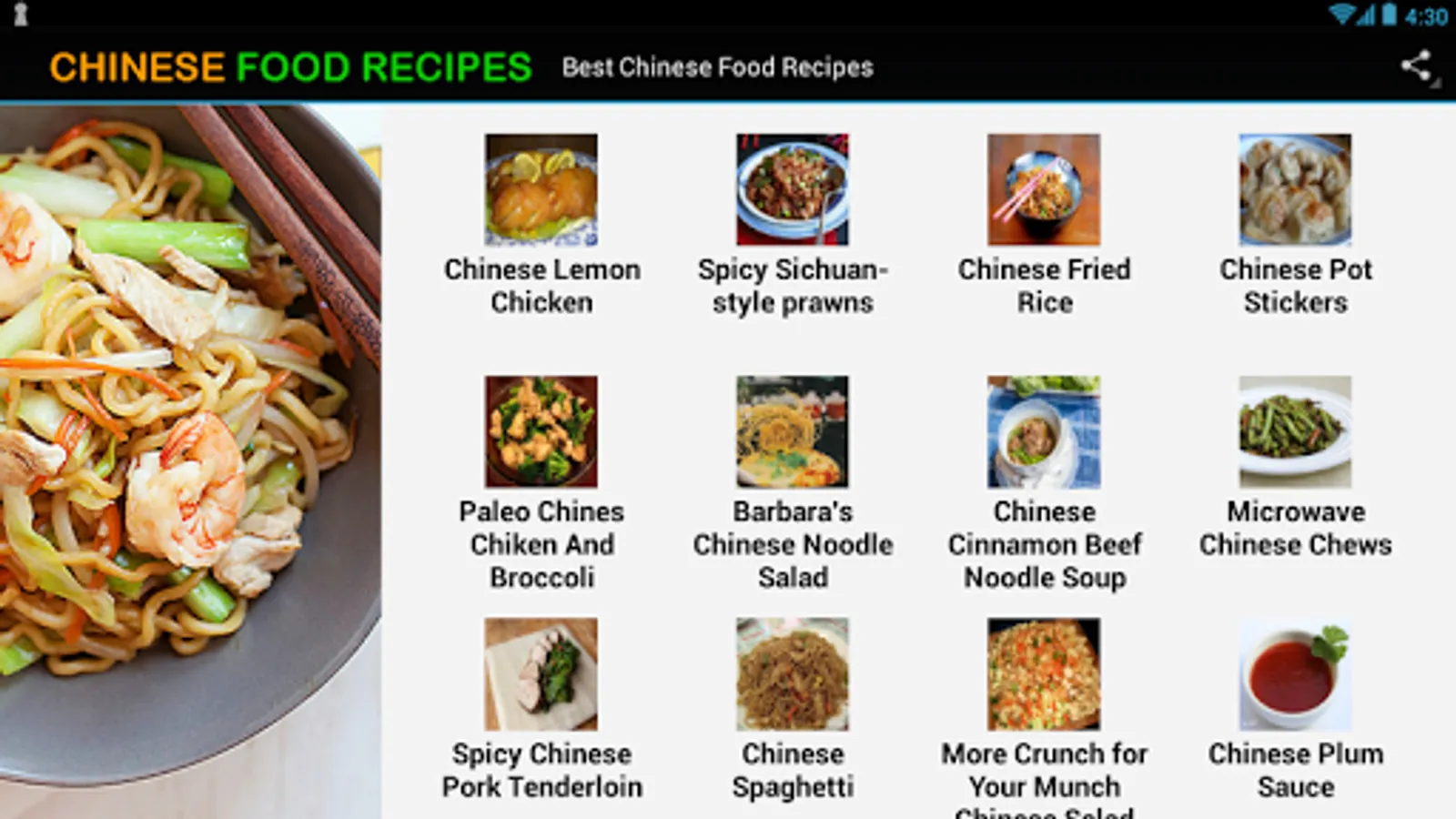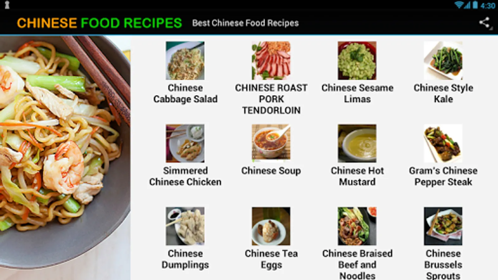 Chinese Food Recipes are one of the best recipes in the world! Main dishes are meat Chinese dishes and Chinese dumplings. Here beside them, u can find great Chinese soups snack recipes and other Chinese recipes. The most delicious and tasty Chinese recipes are noodles and there are lots of ways to make them and u can find all of them here in our app! Soups good as well but the Chinese salads are of the roof too, especially when u have chicken with this salads. The best salad is the summer Chinese salad with mushrooms and carrots. Chinese dishes with vegetables (Asian salad dishes) are also pretty good and u can find them too right here! And of course last but not least we can't forget our Chinese Pancake recipes u can find them aswell. ENJOY!