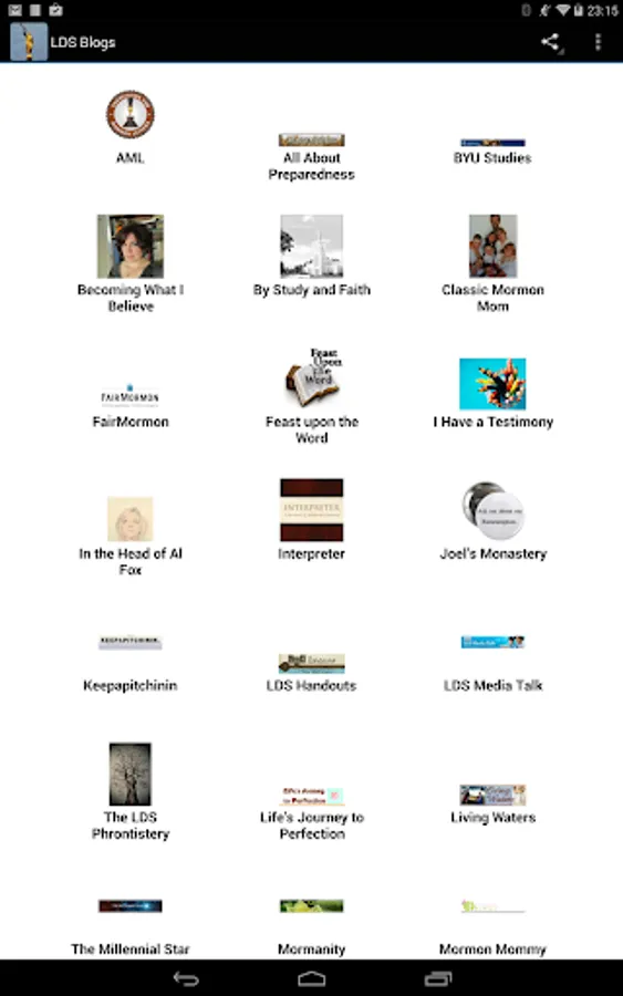 Currently includes: AML, Aggieland Mormons, BYU Studies, Becoming What I Believe, By Study and Faith, Church History, Classic Mormon Mom, FairMormon, Feast upon the Word, Greg Trimble, I go by Ari, I Have a Testimony, In the Head of Al Fox, Interpreter, Joel's Monastery, Keepapitchinin, LDS Daily, LDS Handouts, LDS Media Talk, The LDS Phrontistery, LDS Smile, Life's Journey to Perfection, Living Waters, Middleaged Mormon Man, The Millennial Star, The Moments We Stand, Mormanity, Mormon.org, Mormon Life Hacker, Mormon Mommy, Mormon Nerd, Mormon Scholars Testify, Mormon Women, Mormon Women Stand, Mormonism: Really Want to Know?, Neal A. Maxwell Institute, Newsroom, Poni Almoni, Prepared LDS Family, Primary Mama, Real Intent, Scriptorium Blogorium, Segullah, Sic et Non, Simply Mormon, Spumoni, Studio et Quoque Fide, Sugardoodle, Temple Study, Thoughts from the Hearth, Truth Will Prevail, Warfare and the Book of Mormon, We Talk of Christ We Rejoice in Christ, A Well-Behaved Mormon Woman, Women in the Scriptures, Women of Light