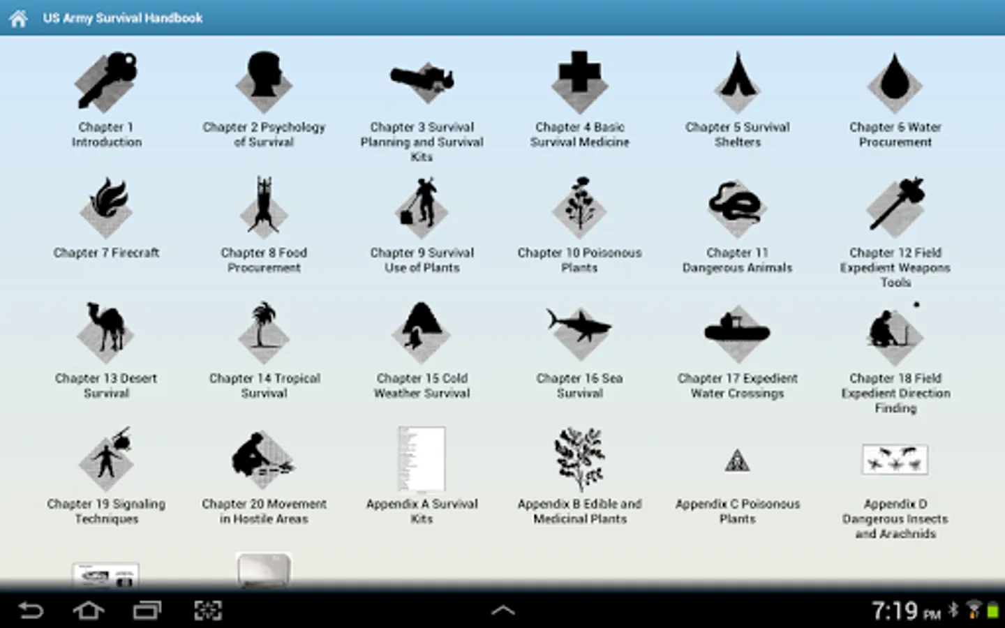 Army Survival Handbook is a free offline manual military guide app for anyone looking for survival manual to use for getting away from it all when dooms day comes or just looking to up your outdoor skills when out camping and backpacking or hunting. Completely experience an amazing camping or backpacking trip with one simple free survival manual handbook!