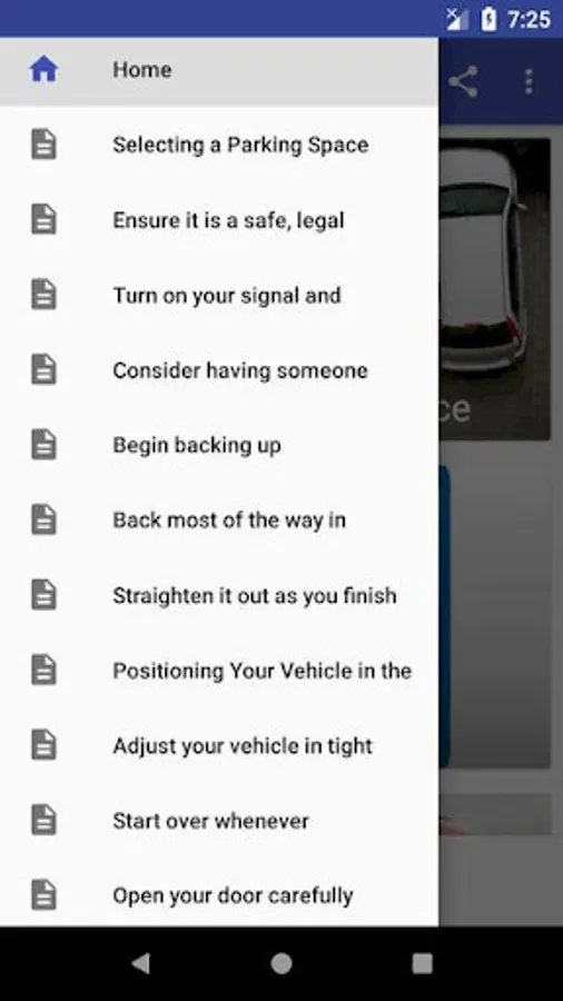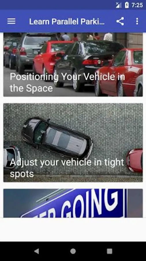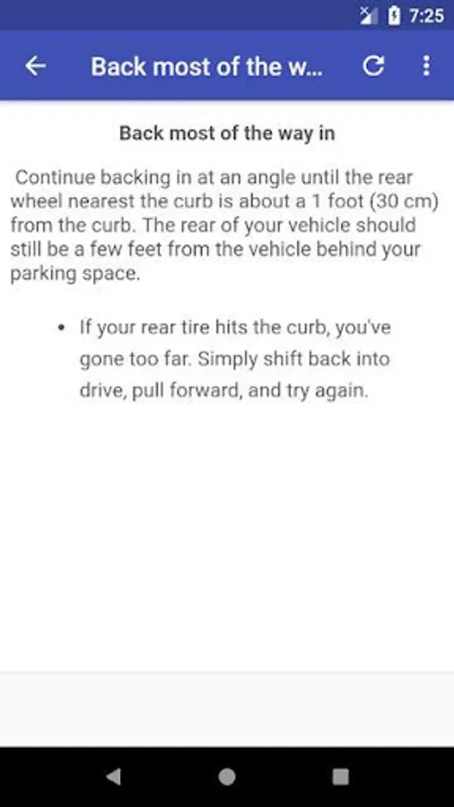 New drivers learn to use reference points to align themselves in relation to the car in front of the space, to determine the proper angle for backing, and to determine when to turn the steering wheel while backing. They may find it easier to briefly stop at each reference point and turn for the next step..