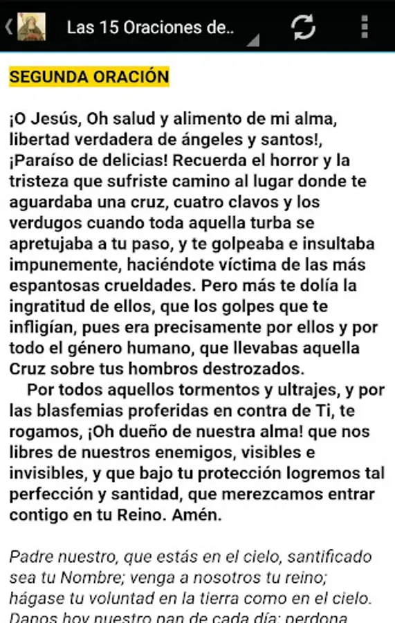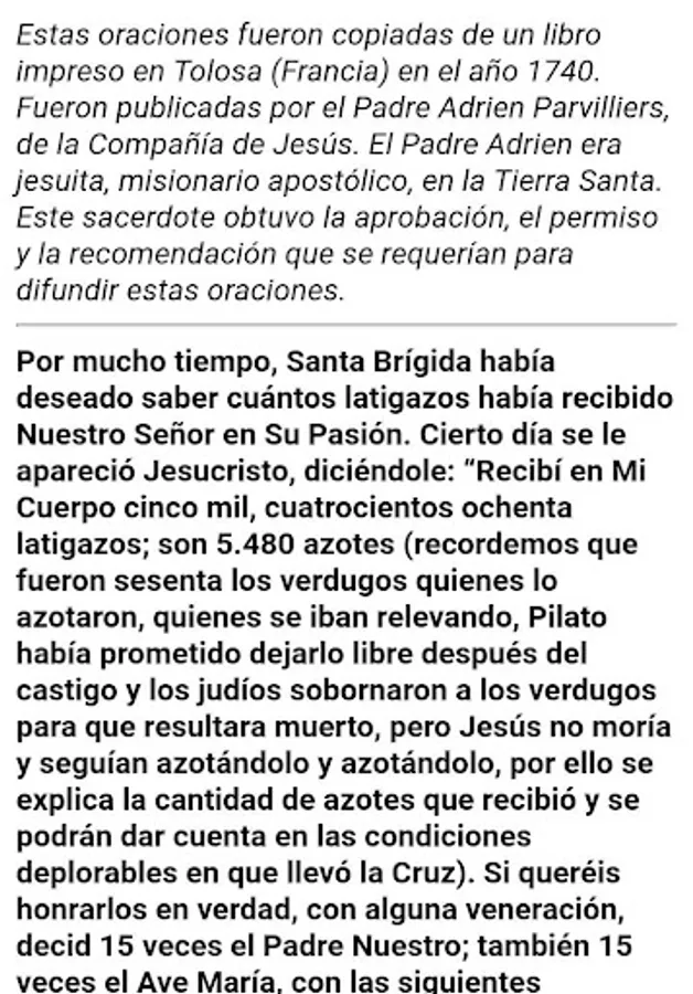 For a long time, St. Bridget had wanted to know how many lashes had received Our Lord in His Passion. One day Jesus appeared to him, saying, "I got in my body five thousand, four hundred eighty lashes; are 5,480 lashes (remember that were sixty executioners who beat him, who were relieving, Pilate had promised him free after punishment and Jews bribed the executioners so it would be dead, but Jesus did not die and were still whipping and whipping, for thus the number of lashings explained and may account in deplorable conditions took the Cross). If you want to truly honor them with some reverence, say 15 times the Our Father; also 15 times the Hail Mary, with the following sentences, for a full year. At the end of the year, you will have honored each of My Wounds. " (Our Lord Himself dictated prayers to the saint.)