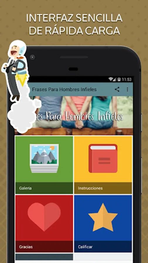 Our app, puts at your disposal more than 70 phrases to unfaithful men, which can express yourself, analyze, reflect, understand, and accept the consequences of what happened in a mature and correctly.