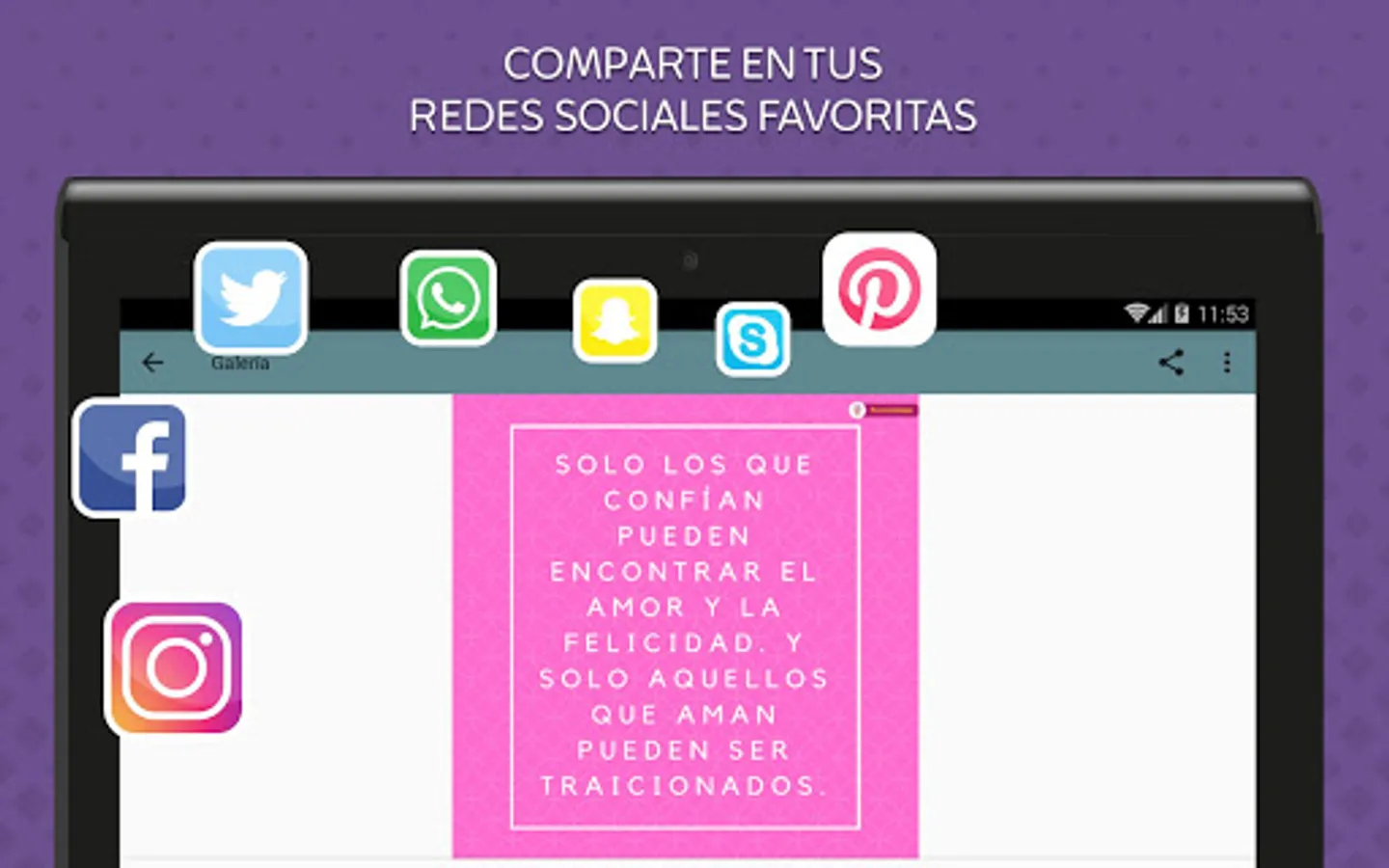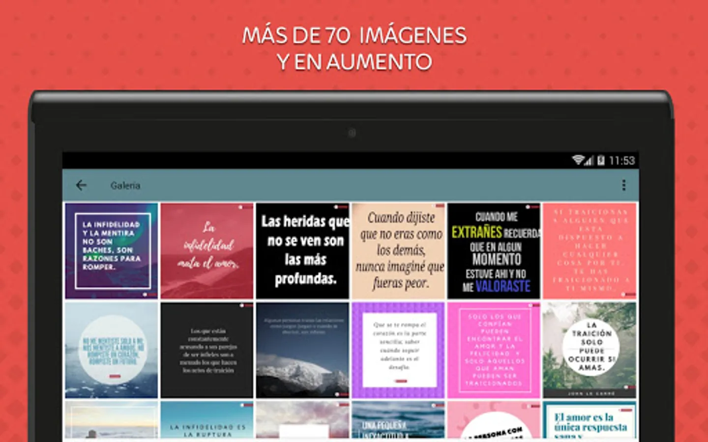 Our application consists of images with phrases, landscapes and strong messages that allow you to renew your soul and freely express what you dare not for fear of what people might say your relatives and acquaintances. Enjoy a wide variety of phrases to unfaithful men with whom you can renew your devices and social networks whenever you want.