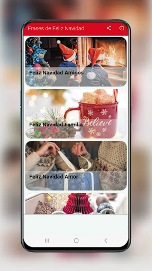 The application "BEAUTIFUL MERRY CHRISTMAS PHRASES" contains beautiful phrases, accompanied by beautiful images, divided into 4 categories that are the following:
