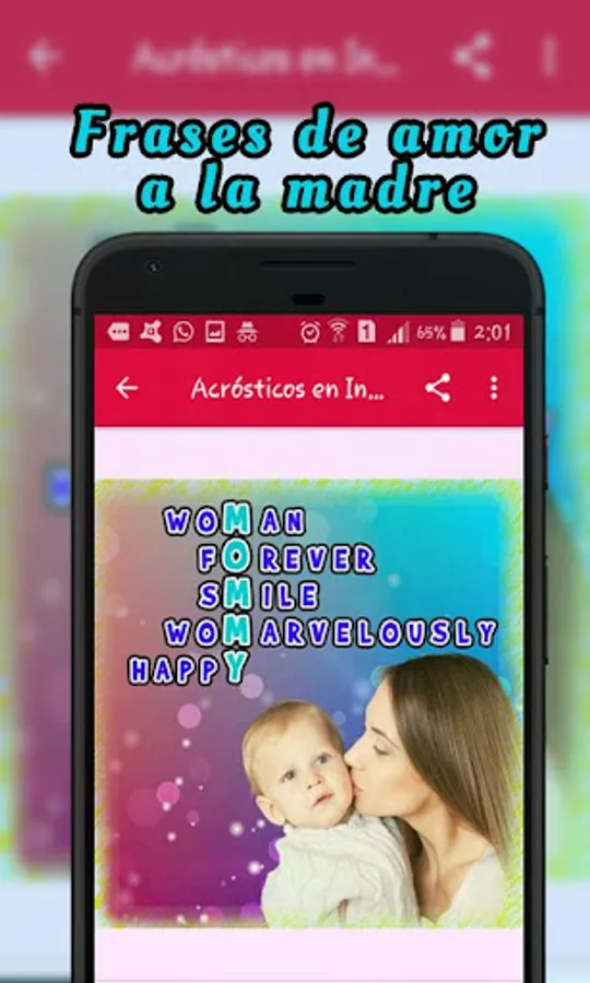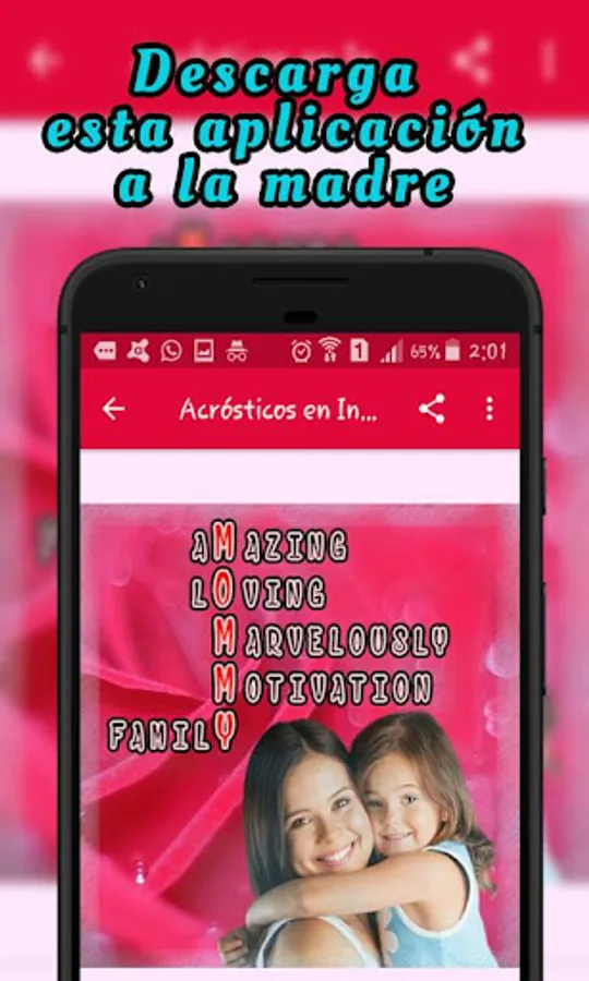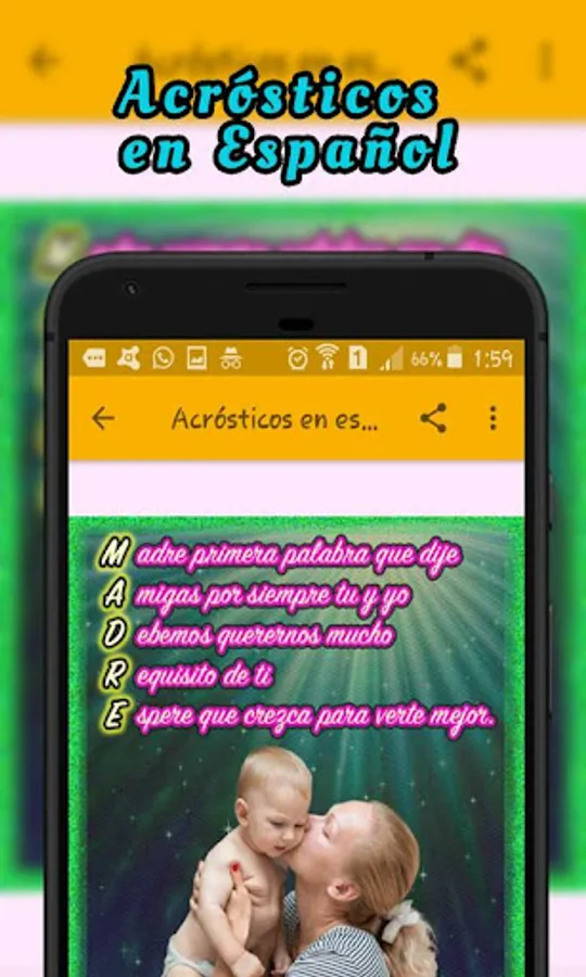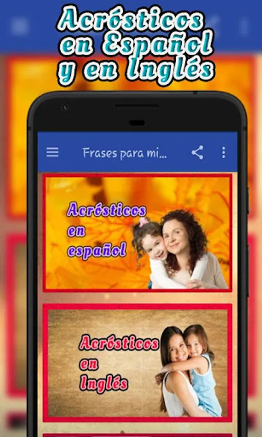 "LOVE PHRASES FOR MY BELOVED MOTHER" is an application that is designed with beautiful messages of affection and with striking acrostics with beautiful messages to the mother, they are in two languages in Spanish and in English, for all women, and you can share it with your sister, aunt, grandmother, family and with all your friends because they are potential mothers, make them feel that they are loved, just as they really deserve it.
