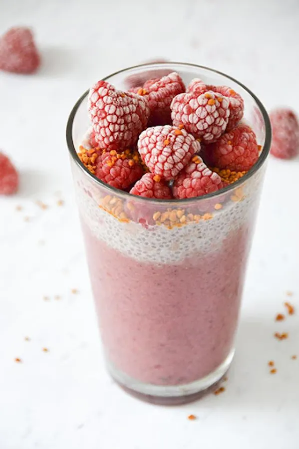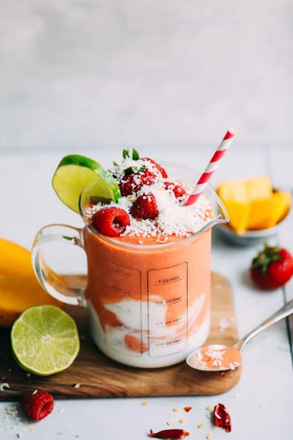 A smoothie can be made from blended raw fruit, vegetables with other ingredients such as water, ice, or sweeteners.