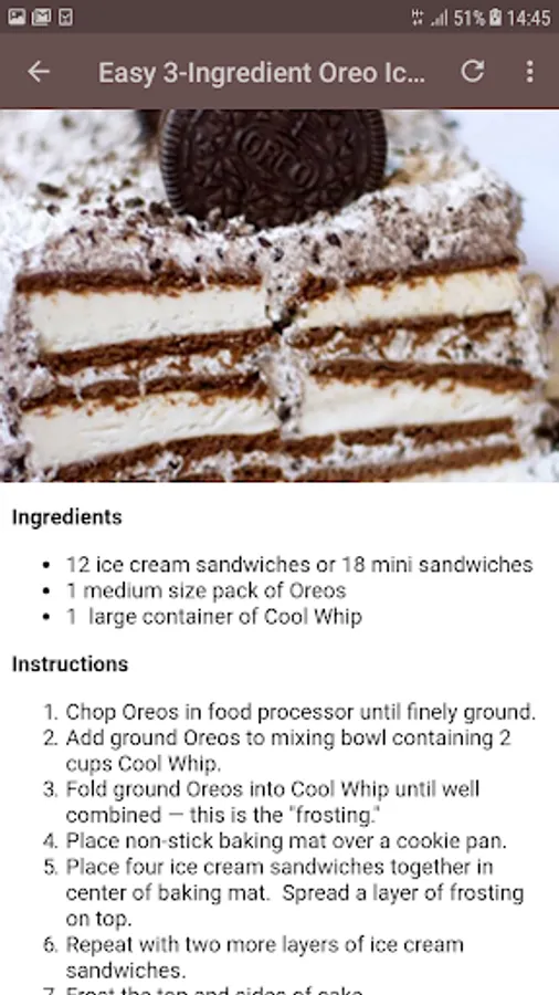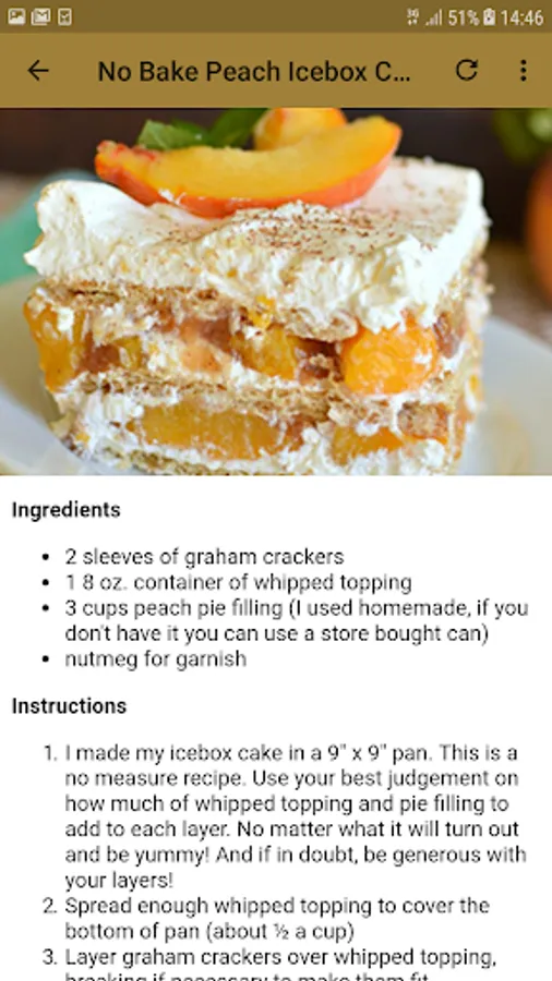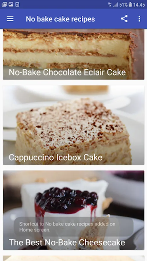 We’ve got plenty of delicious No bake cake recipes for you to choose from our app. All recipes are perfect for everyone, because you can make it very quickly and easy. Almost every No bake cake recipe can be done in 30 minutes or less.