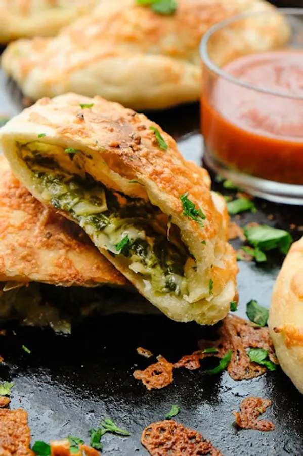 Calzone, a traditional Italian stuffed bread, is made from salted bread dough, baked in an oven and is stuffed with salami, ham or vegetables, mozzarella, ricotta and Parmesan or pecorino cheese, as well as an egg.
