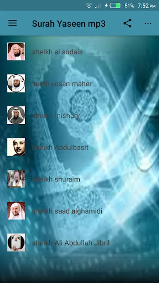 This a application contain the recitation of surah yaseen by seven world famous quran reciters in the world, those sheikhs are: