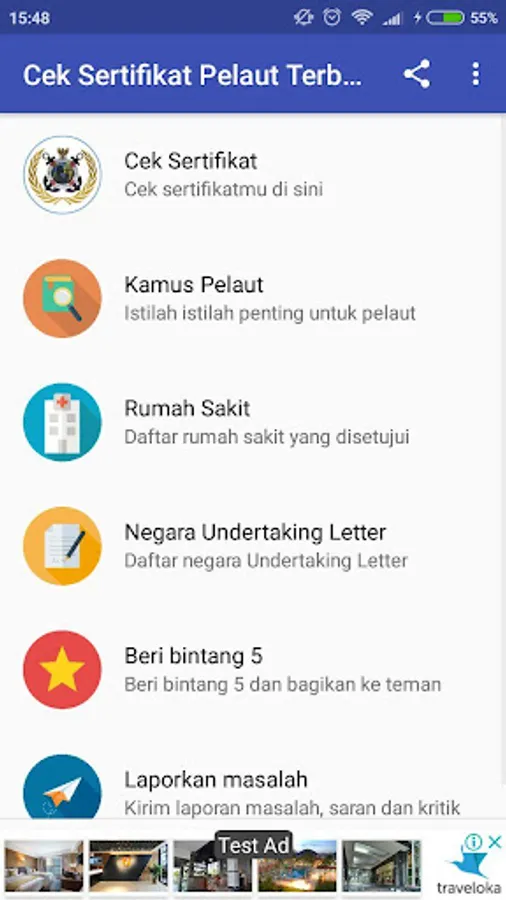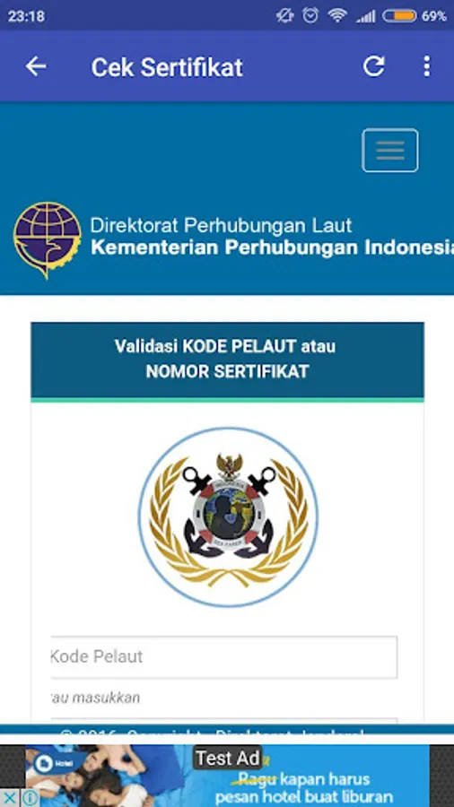Cek Sertifikat Pelaut Terbaru digunakan untuk melakukan pengecekan sertifikat pelaut. Selain sertifikat pelaut, terdapat juga kamus pelaut yang berisi isitlah-istilah penting untuk pelaut, data negara-negara yang telah menandatangani Letter of Undertaking dan daftar rumah sakit yang telah mendapatkan persetujuan.