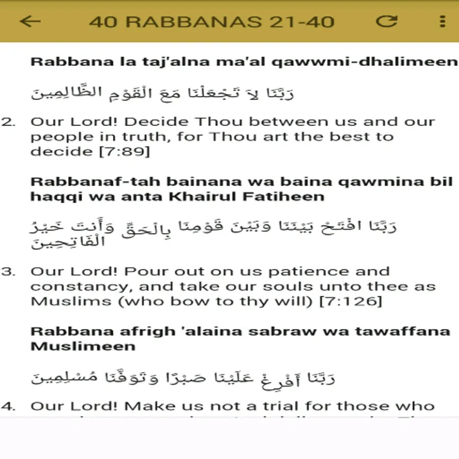 In this free app you will find the recitation of 40 Rabbana dua. A famous compilation of duas, these forty duas starting with Rabbana meaning our lord are all derived from the Holy Quran. Rabbana being the plural of Rab (Allah)
