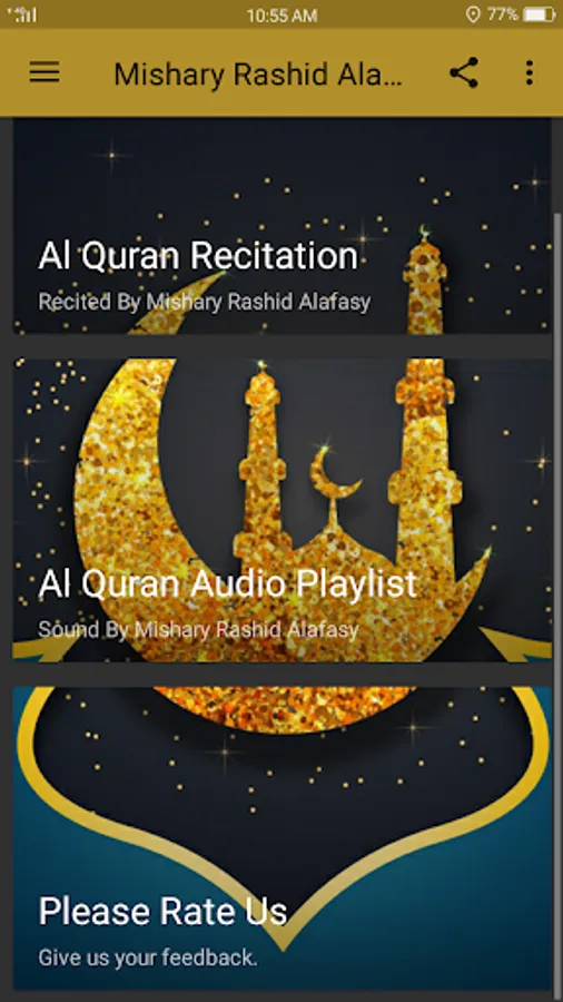 This is a Free Mishary Rashid Alafasy Holy Quran. With this App, you can listen to your Quran recited by Mishary Rashid Alafasy Quran Full version. And also include Holy Quran Text in Arabic for you to read. Download this free app and you can have the Holy Quran Arabic sound by Mishary Rashid Alafasy with you all the time.