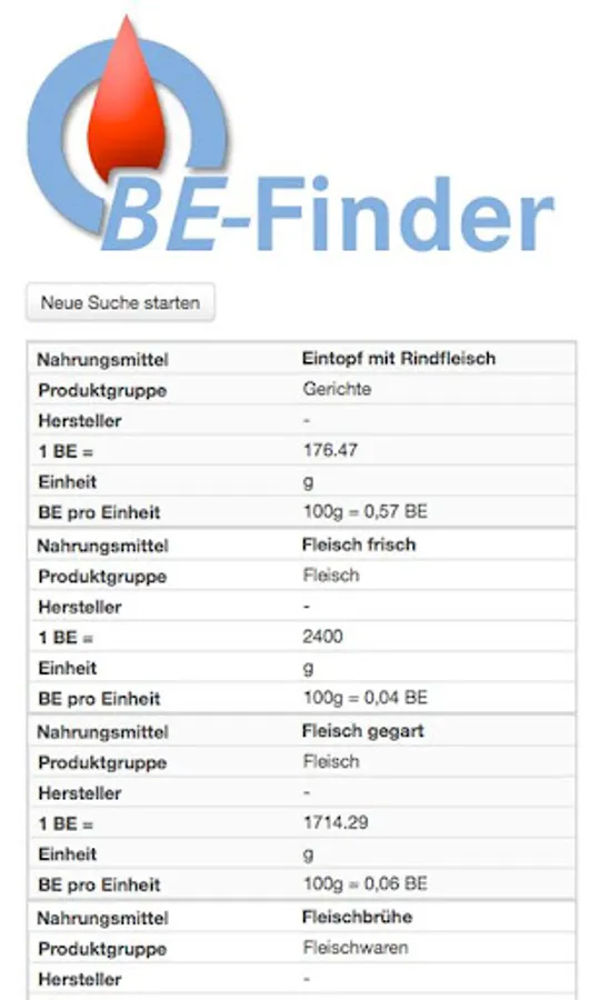 The database has been compiled with the greatest care. It is based on the carbohydrate information from the German Food Code, the University of Hohenheim, the National Agricultral Library of the USDA and the manufacturers. However, the database can still contain errors. Therefore, the BE-Finder can only serve as a guide. It does not release you from checking your blood sugar levels after eating.