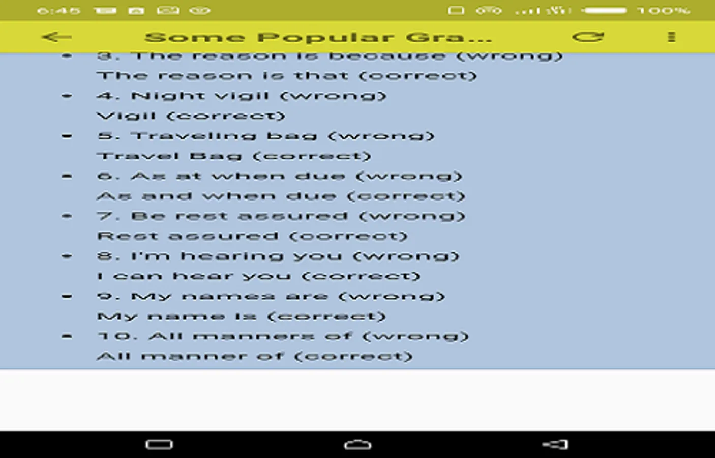 This app contained information about mistakes in english language in speaking, reading and writing. it contained correct sentences.