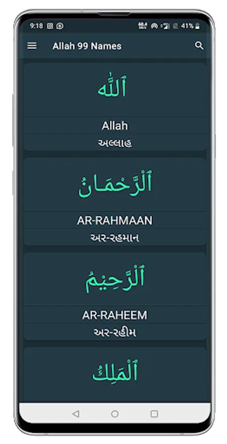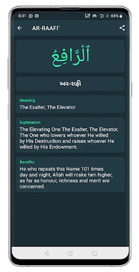 • Read all the 99 names in Arabic, English & Gujarati with Meanings, Detailed Explanation & Benefits