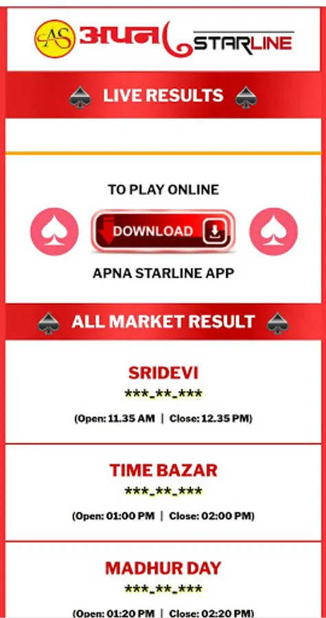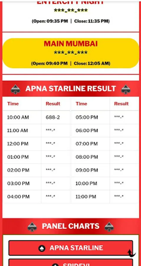 Apna starline app shows result of various matka results and panel charts