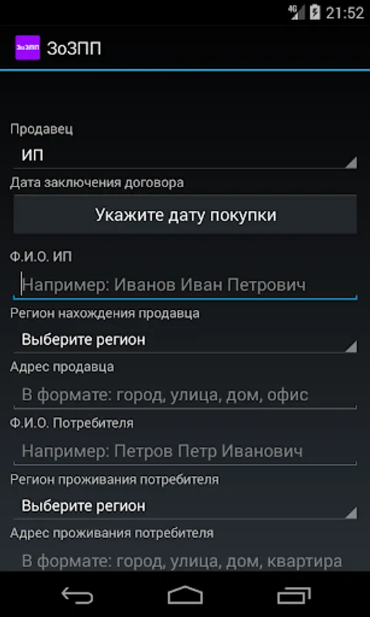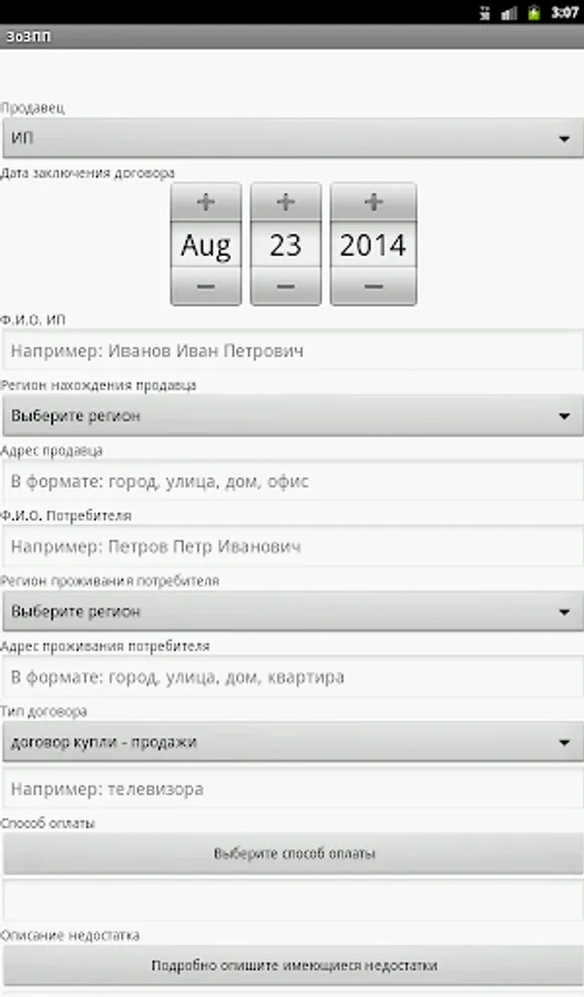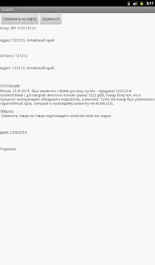 The application contains a constructor, with the help of which you can independently, using the information you know about the seller and the defective product / service, make a claim.