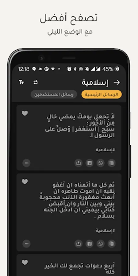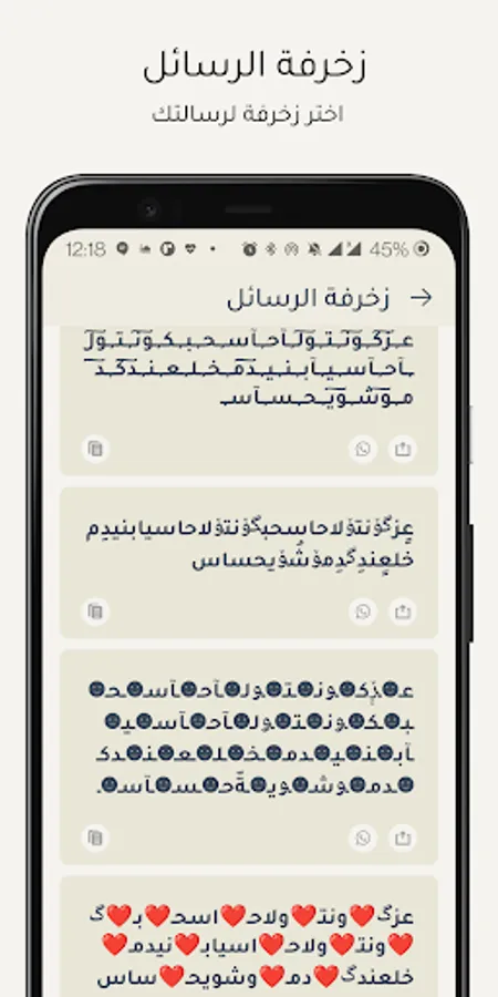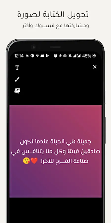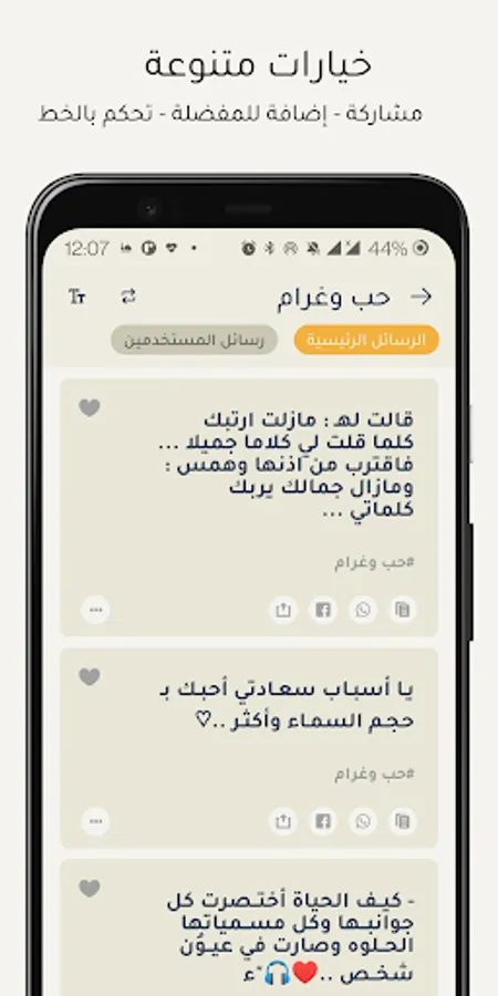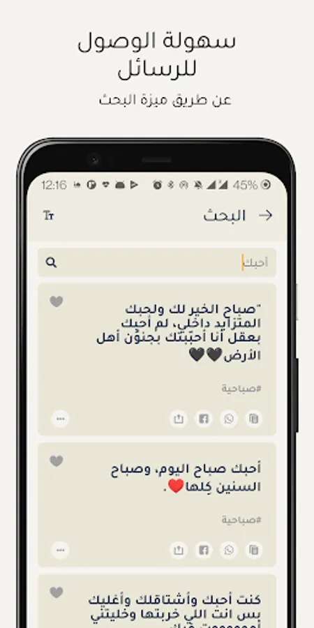 شارك وحمل الحالات والكلمات عبر جميع مواقع التواصل الاجتماعي مثل فيسبوك، ماسنجر، واتساب، انستغرام، وعبر أي تطبيق يدعم ميزة الإرسال