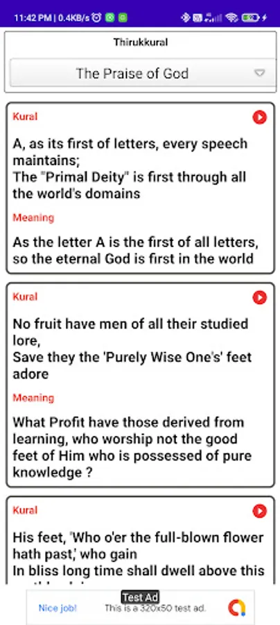 The Thirukkural is structured into 133 chapters, each containing 10 couplets, for a total of 1330 couplets. The 133 chapters are grouped into three sections: Each Kural or Couplet contains exactly Seven words.