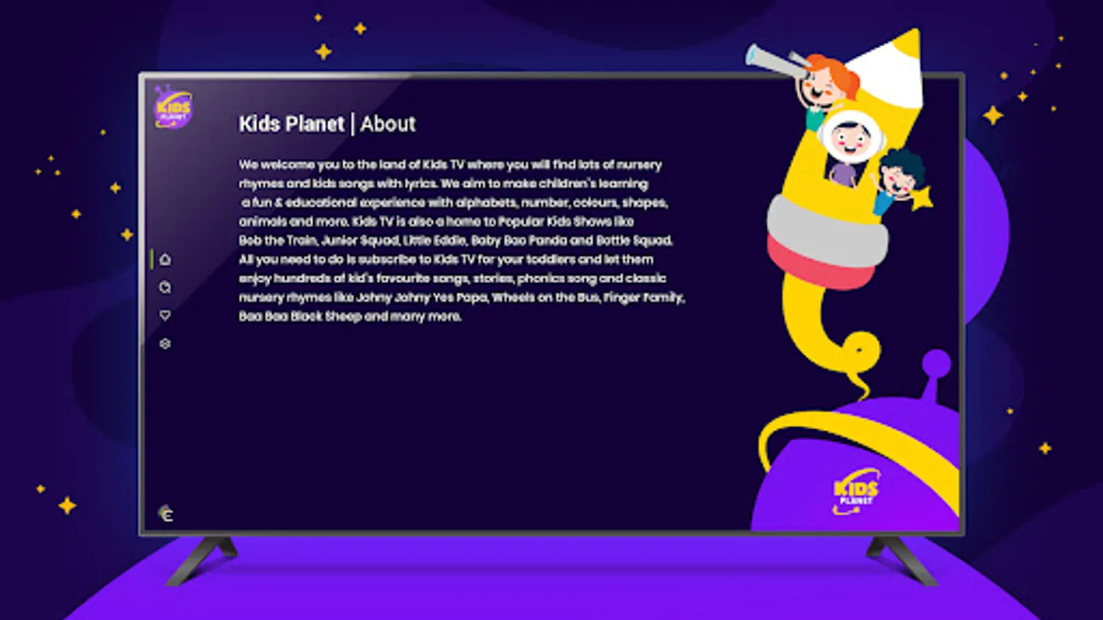We welcome you to the land of Kids Planet where you will find lots of nursery rhymes and kids songs with lyrics. rnWe aim to make children’s learning a fun & educational experience with alphabets, number, colours, shapes, animals and more. rnKids Planet is also home to Popular Kids Shows like Bob the Train, Junior Squad, Little Eddie, Baby Bao Panda and Bottle Squad.rnAll you need to do is subscribe to Kids Planet for your toddlers and let them enjoy hundreds of kid’s favourite songs, stories, phonics song and classic nursery rhymes