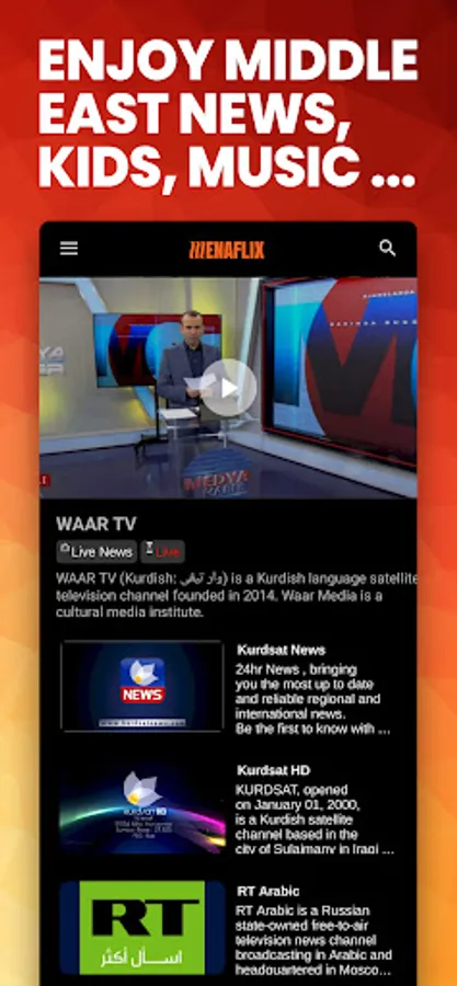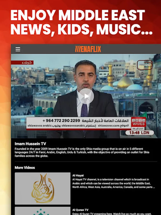 On Menaflix you can watch live and VOD channels from the entire middle east, whenever you like and from any device. Watch News, Entertainment, Ethnic, Kids, Music, even your favorite Radio shows here, as much as you want, whenever you want and from anywhere. It is stable, easy to use with 24/7 access and support, compatible and available on all web and smart TV platforms.