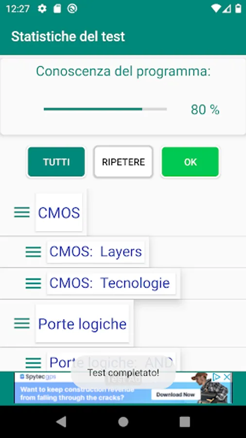 At the end you will have the possibility to check the percentage of covered work and topics that you know better and who would agree to repeat.