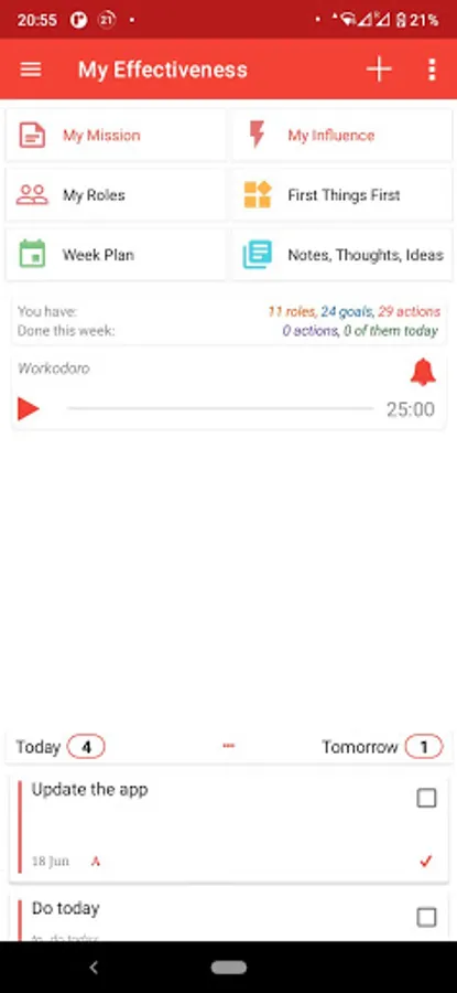Your can have your To Do tasks as a list, a checklist or a project. To do a task you can mark it as done. A goal usually consists of actions (To Do-s) to achieve it. You can mark a goal as done too. In the app you'll have your To Do tasks grouped by your life roles. Each role can have multiple goals.