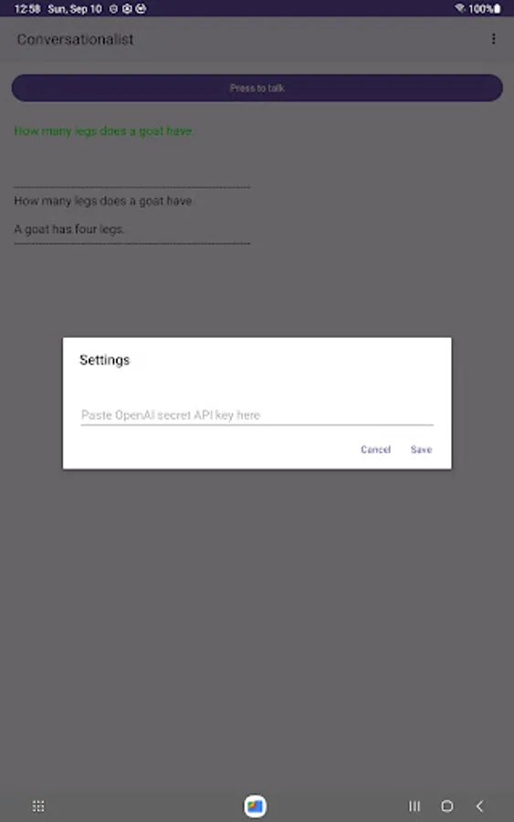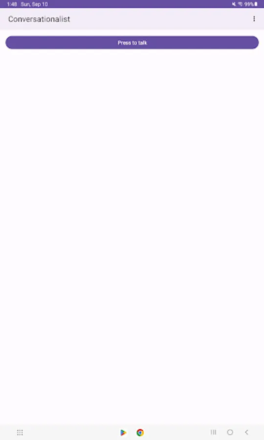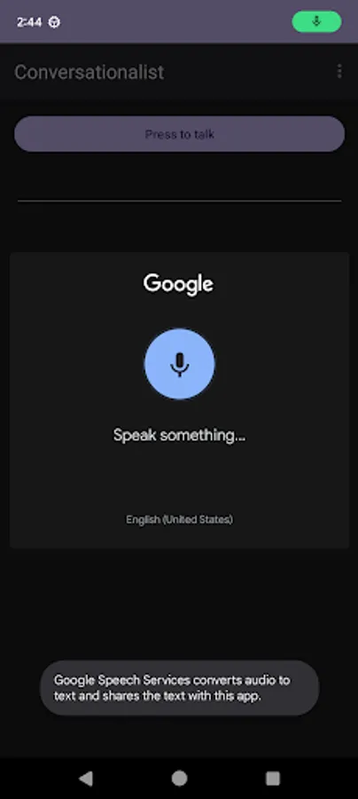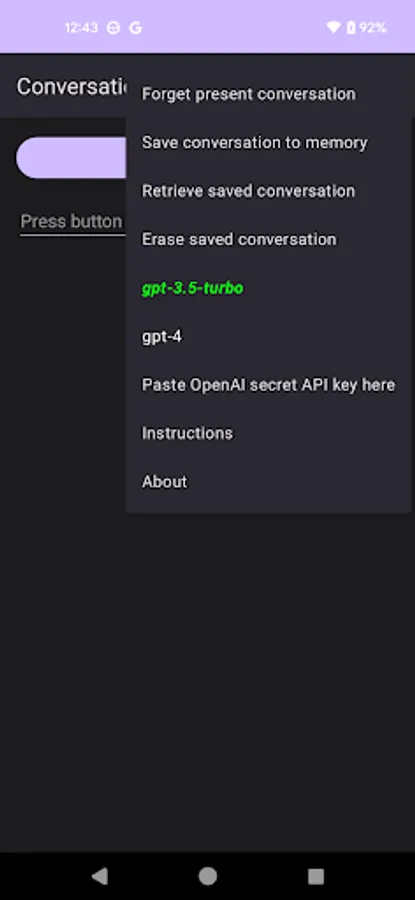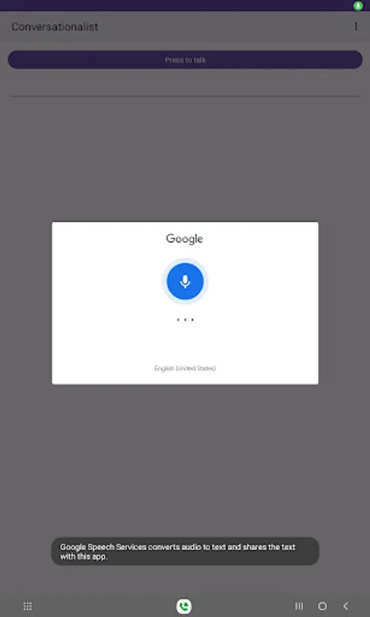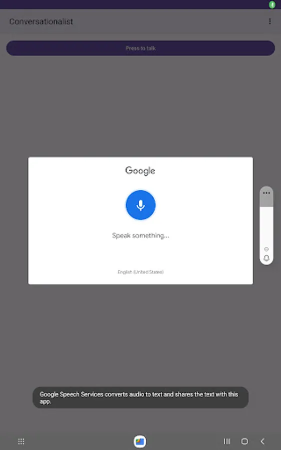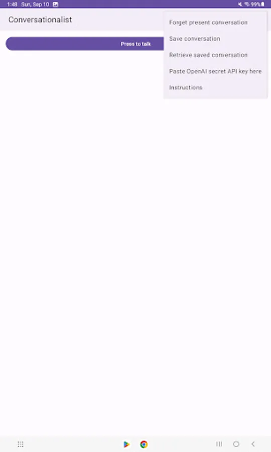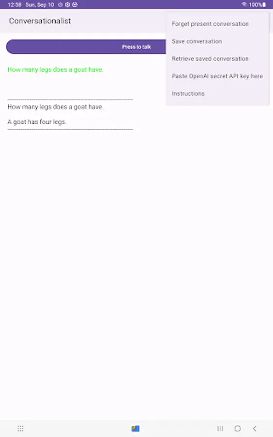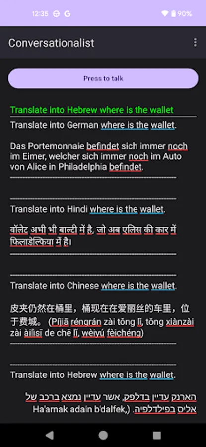 Conversationalist enables a speech-to-speech conversation with very inexpensive, artificial intelligence called Chat GPT 3.5. Written and verbal translation into Hindi, Chinese, Hebrew, German, etc.