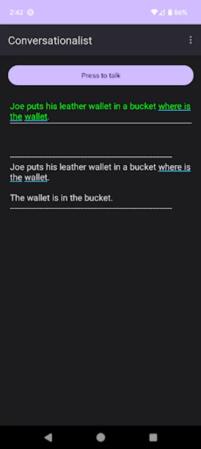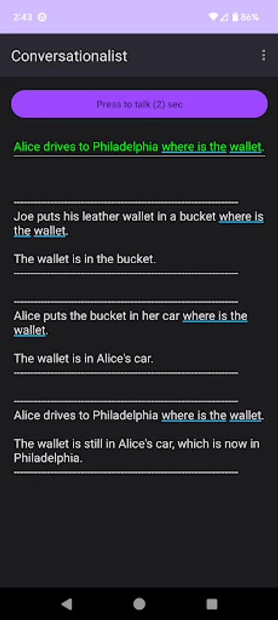 A written transcript of the conversation is shown on the screen. It can be saved, and recalled later in order to continue the conversation.