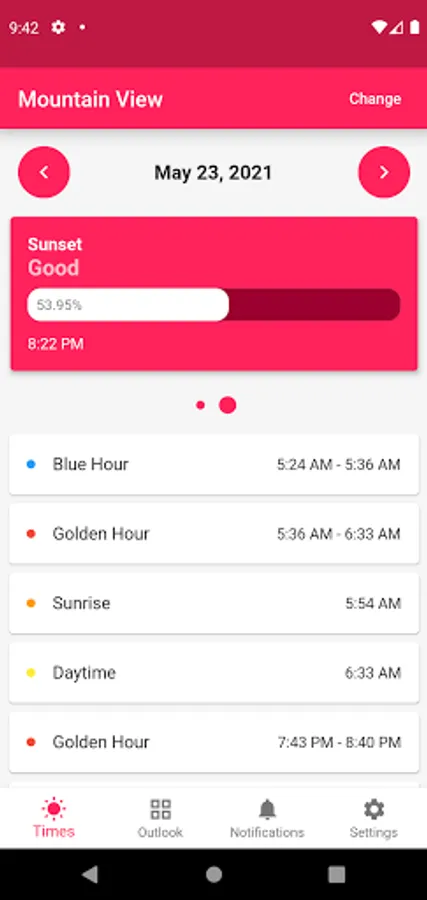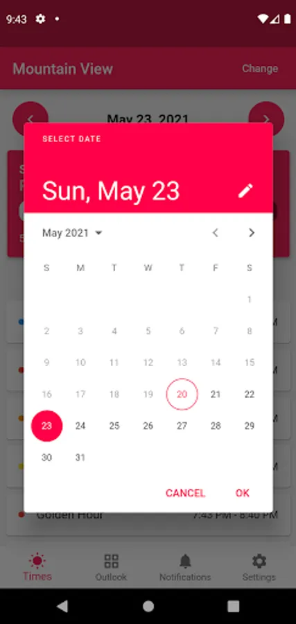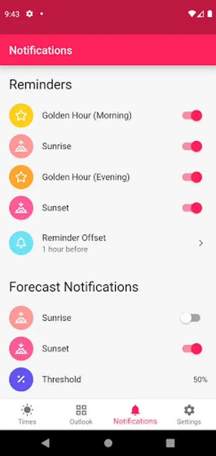 - Setup notification reminders for Sunrise, Sunset and Golden Hours.