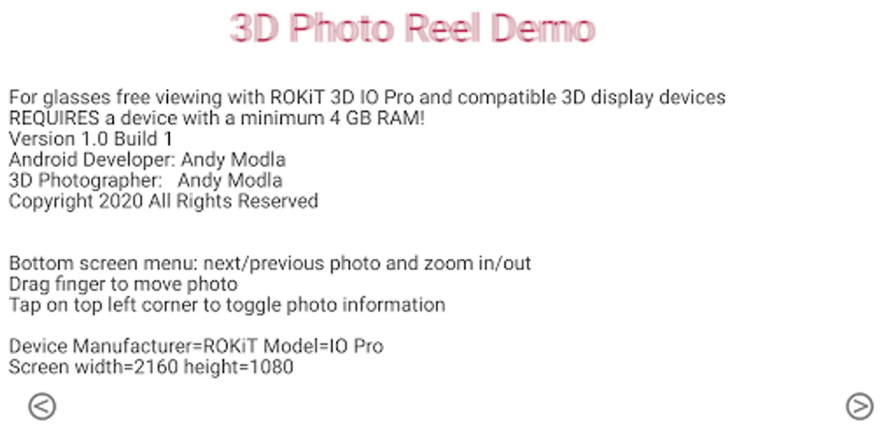 This demo app displays 3D photos in a loop for glasses free viewing on the ROKiT 3D Pro phone and other compatible column-interlace 3D display phones or devices.