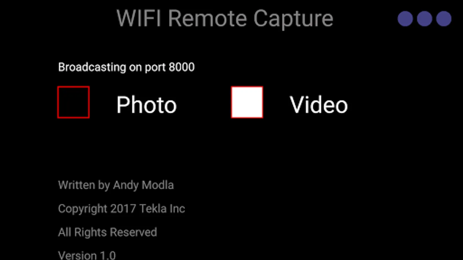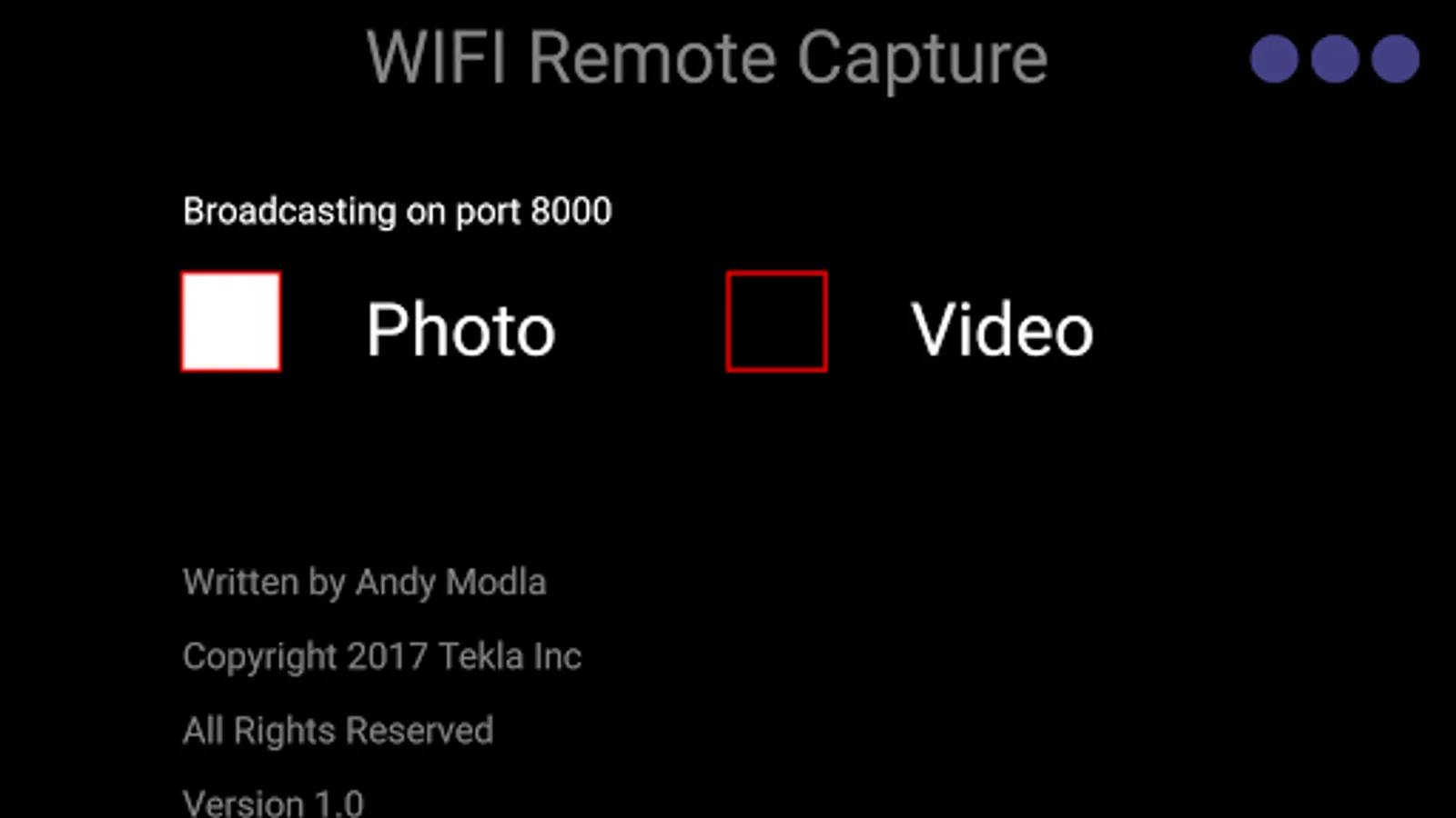 The Open Camera Remote app listens for broadcast message commands when connected to a local WiFi network. The Open Camera Remote app should be set in either photo or video recording mode before capture with that mode.