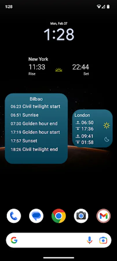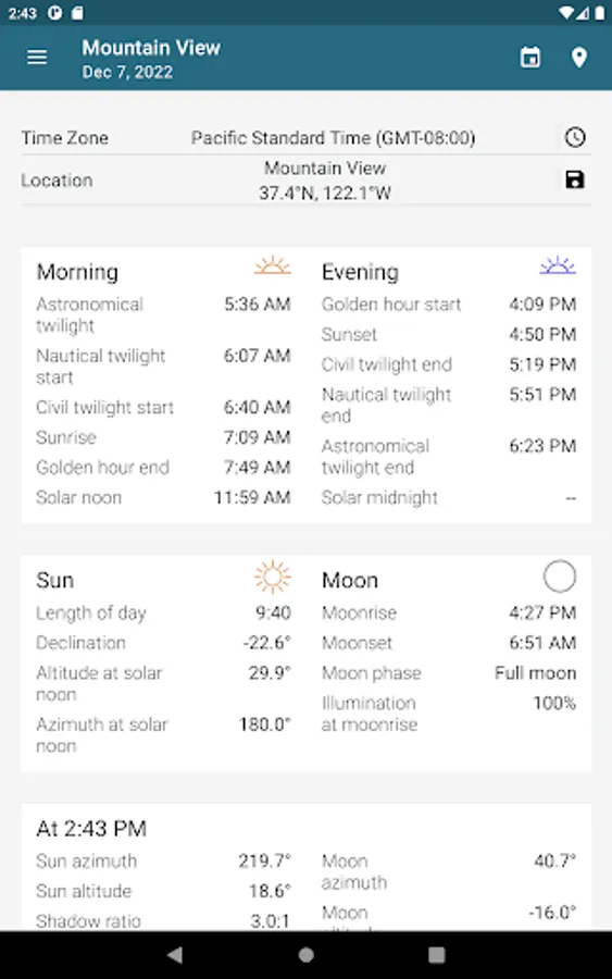 The app has a map view which plots the daily sun and moon path relative to your current location. It also contains a widget for your home screen showing sunrise/set times for the current day and your current location.