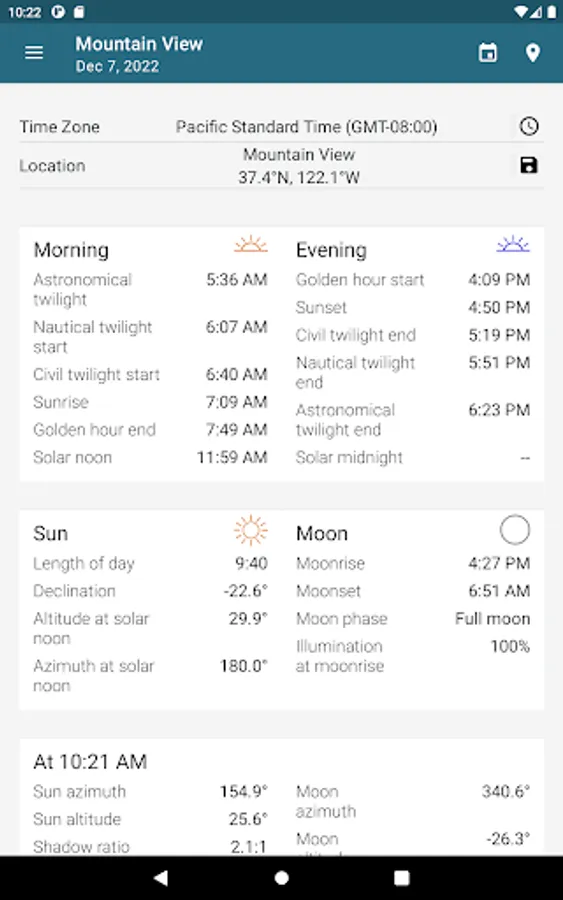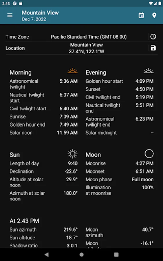 Sun Position shows you sunrise and sunset times, as well as the solar and lunar path on an augmented reality camera view for any day of the year at your current location. Its handy data screen also gives you other useful information including moon rise/set times, golden hour and twilight times, and moon phase information.
