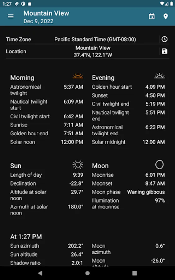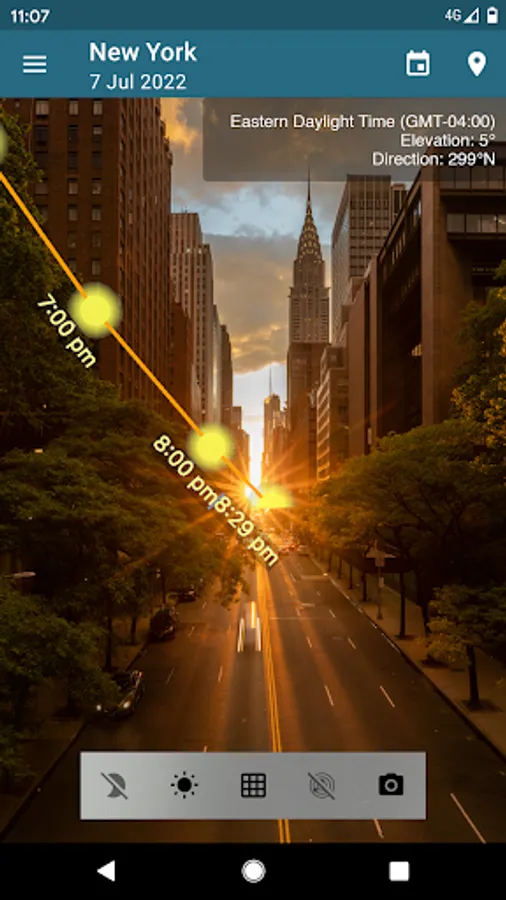 Sun Position shows you sunrise and sunset times, as well as the solar and lunar path on an augmented reality camera view for any day of the year at your current location. Its handy data screen also gives you other useful information including moon rise/set times, golden hour and twilight times, and moon phase information.