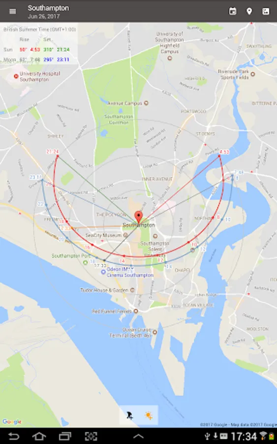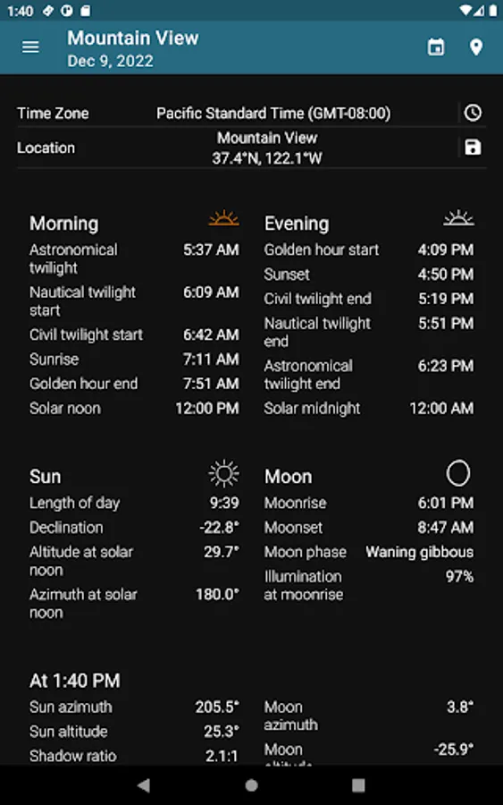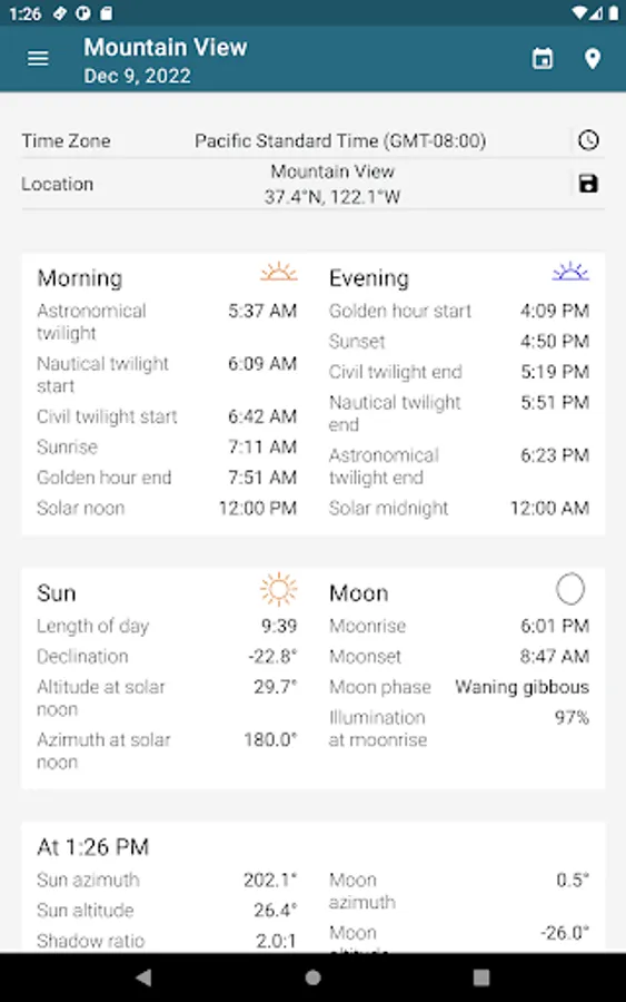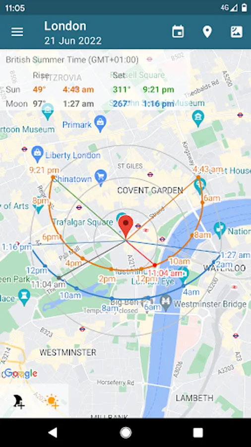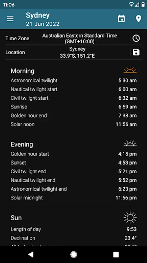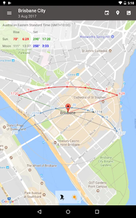 The app has a map view which plots the daily sun and moon path relative to your current location. It also contains a widget for your home screen showing sunrise/set times for the current day and your current location.