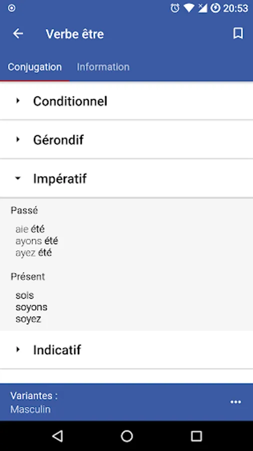 You can conjugate the verbs of the French language in all modes (indicative, subjunctive, conditional, imperative, participle, infinitive, gerund ...) and all times (present, Past, future, imperfect, more than perfect ...).