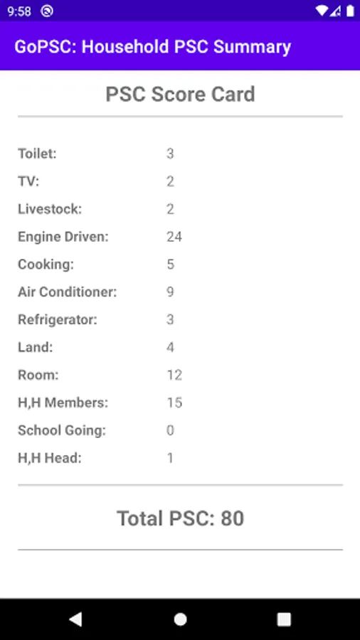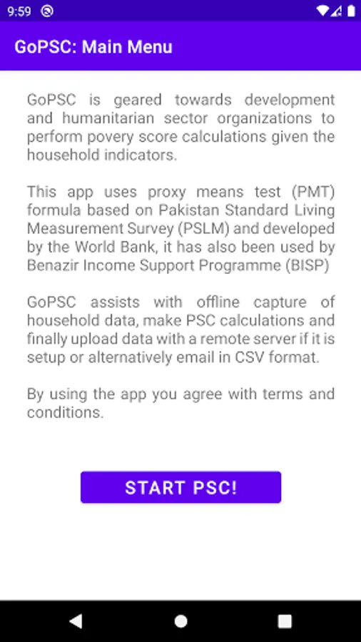 This app uses proxy means test (PMT) formula based on Pakistan Standard Living Measurement Survey (PSLM) and developed by the World Bank, it has also been used by Benazir Income Support Programme (BISP), GoPSC assists with offline capture of household data (via field interviews at remote locations), make PSC calculations and finally present the score to the user.
