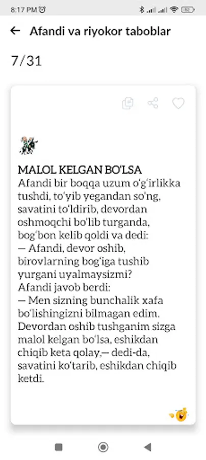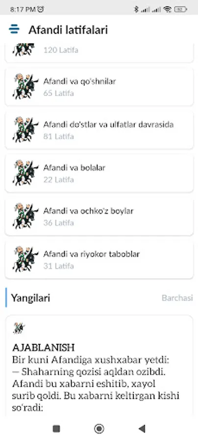 Afandining jozibali latifalar to'plami orqali uning dono va o'ylantiruvchi mulohazalari bilan tanishishga tayyor bo'ling. Afandi o‘z hikoyalari va nutqlari bilan millionlab insonlar qalbidan joy olgan sharq olamining mashhur personajidir. U haqidagi latifalar bebaho hayotiy saboqlar bilan to'ldirilgan bo'lib, odamlarga hayotning ko'plab qiyinchiliklarini inoyat va qadr-qimmat bilan yengish imkonini beradi. Afandining hayot va ular orasidagi barcha narsalar haqidagi latifalari bilan tanishish uchun hozir ushbu ilovani yuklab oling. Do'stlaringiz va yaqinlaringiz bilan baham ko'rish uchun baho bering va sharh yozing.